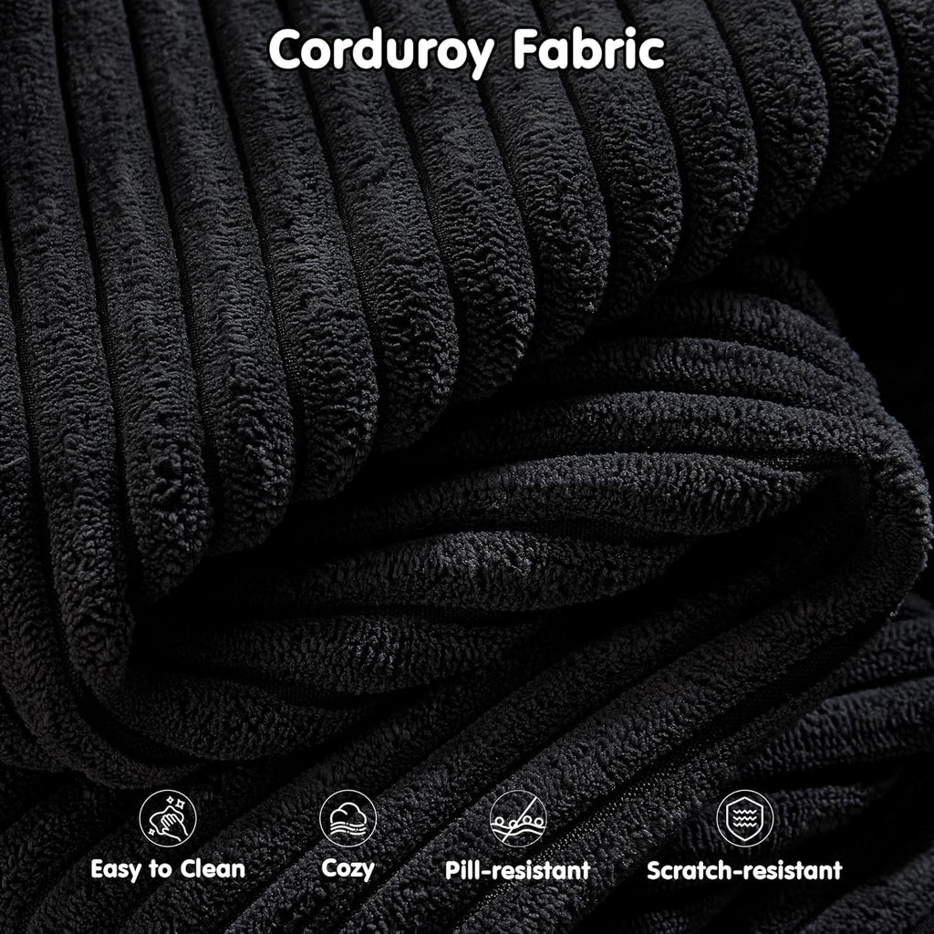 - Corduroy fabric in black — extra-soft, warm, and naturally resilient against stains while maintaining a sophisticated look.