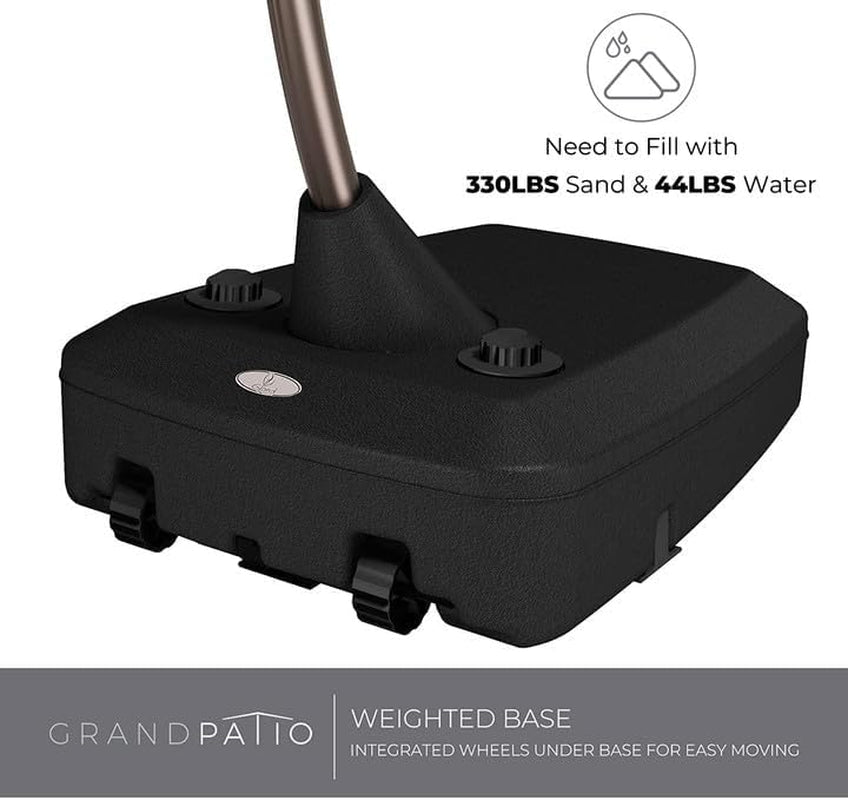 - Stable and mobile base — base with wheels for easy relocation; fill with 330 lbs of sand and 44 lbs of water (374 lbs total) for solid coverage; close into deadlock position for safety in bad weather.