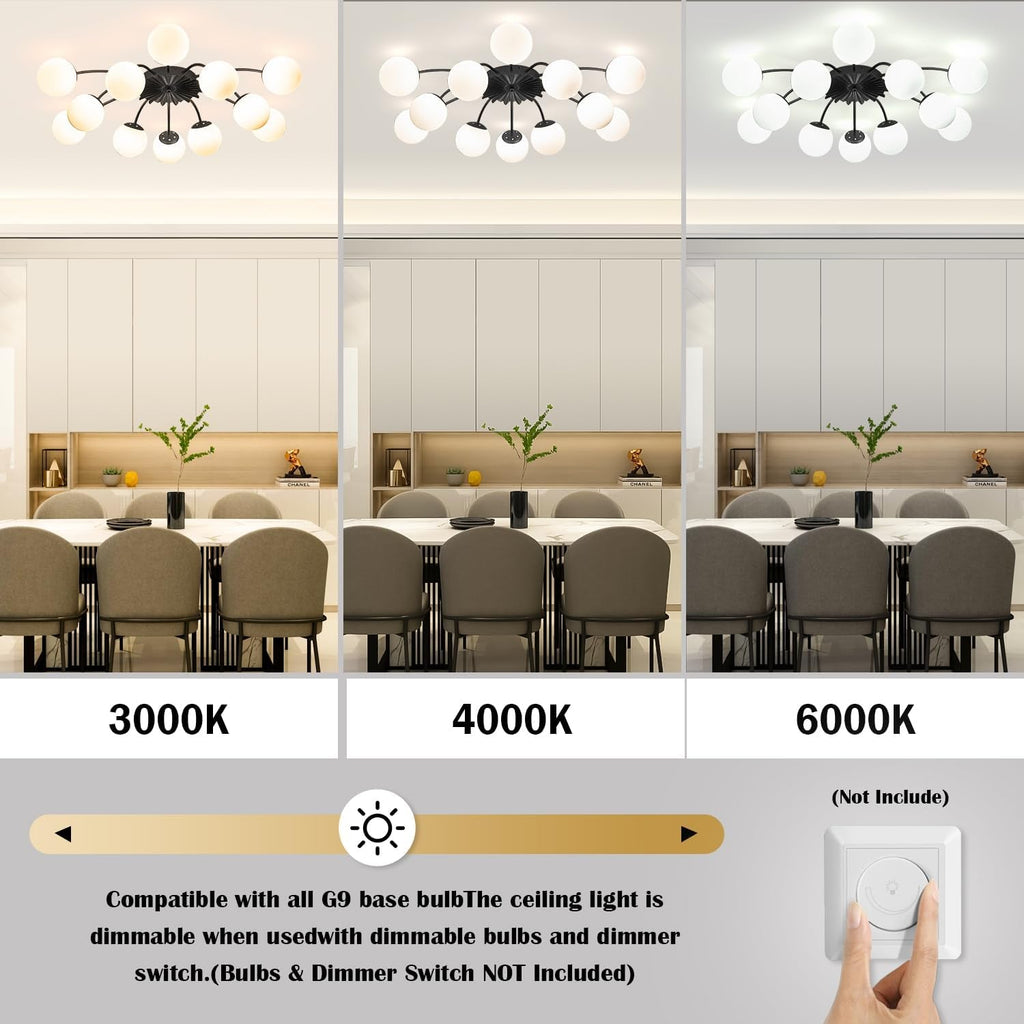 - G9 bulb compatibility — uses 12 bulbs (not included); fully dimmable with a compatible dimmer for warm or bright ambiances; color temperature options 3000K/4000K/6000K for exact mood.