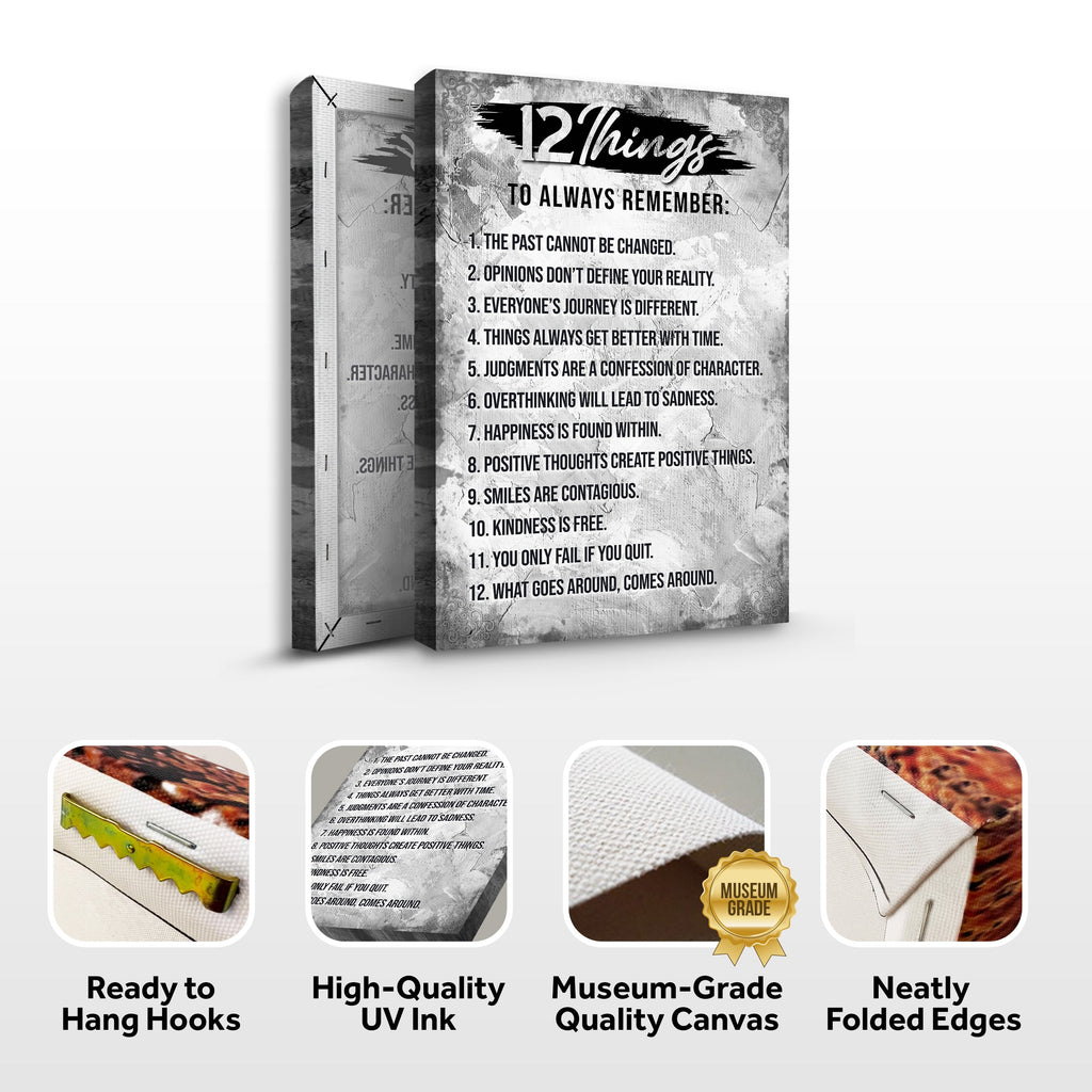 The 12 Things To Remember Sign is an excellent gift for friends, family members, teachers, and coworkers. This inspirational wall art is perfect for any room in your home or office. It will help you remember important things in life. Plus, it is printed on museum-quality canvas with UV-resistant ink to ensure vibrant colors that will last over time, and it is ready to hang out of the box with no assembly required!