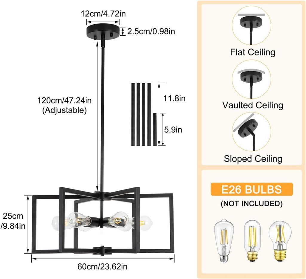 - Adjustable hanging height: 5.9" to 53.1" to fit varying ceiling heights and dining configurations. Includes one 5.9" rod and four 11.8" rods for customizable styling.
