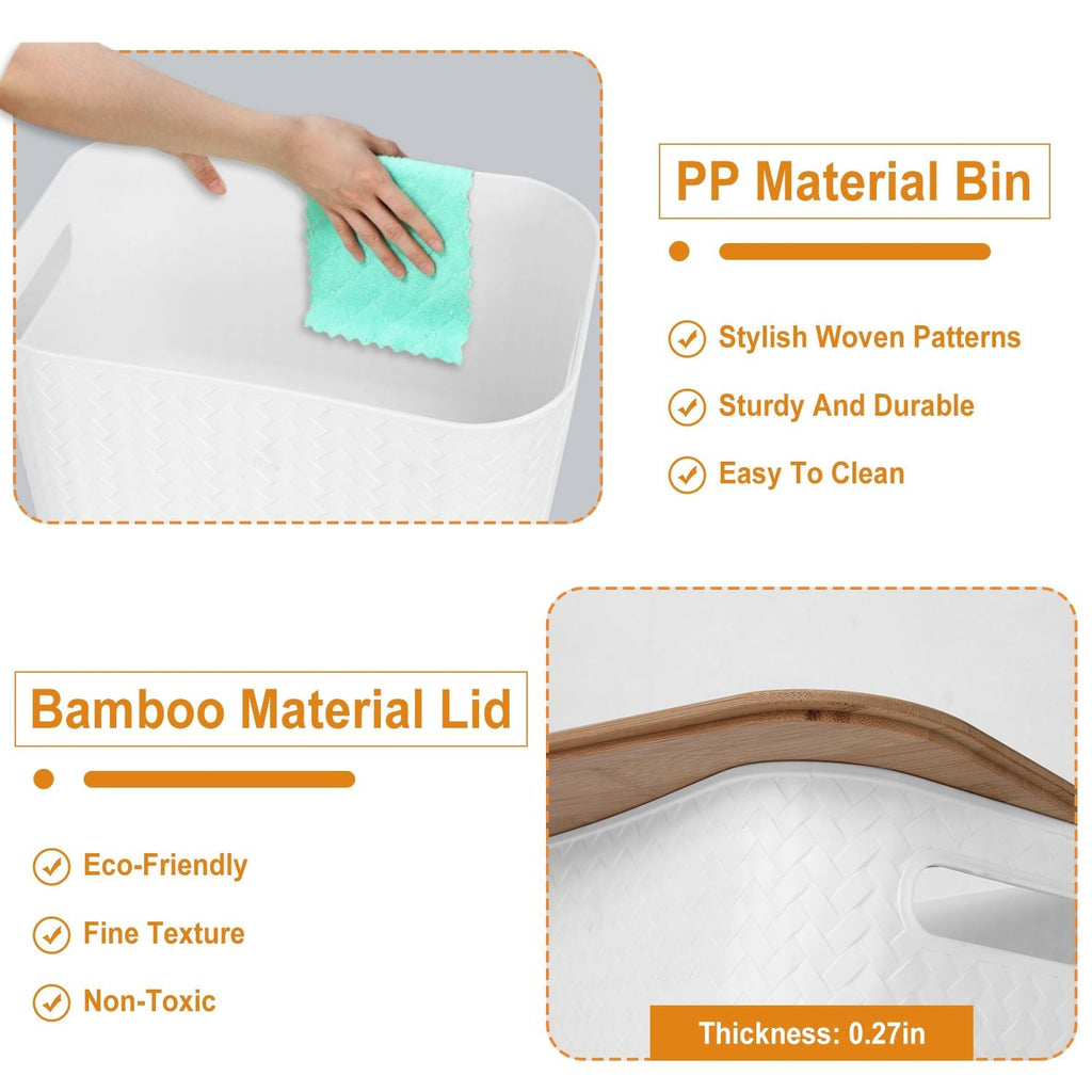 This set of 2Pcs storage bins with bamboo lids is designed to help you organize and store various accessories. Each bin measures 9.84x6.69x6.1in and comes with a durable PP material body and a sturdy lid made of natural, eco-friendly bamboo. The convenient handle on each side allows for easy transport and the stackable design helps save space. These modern and stylish bins are the perfect storage solution for cabinets, shelves, closets, bedrooms, kitchens, offices, bathrooms, and living rooms. With a lid size of 25.5x18x0.7cm and a bin size of 25x17x15.5cm, they are suitable for a wide variety of items, such as kitchen jars, toys, books, and office supplies. Keep your room tidy and clean with this practical and affordable storage option.