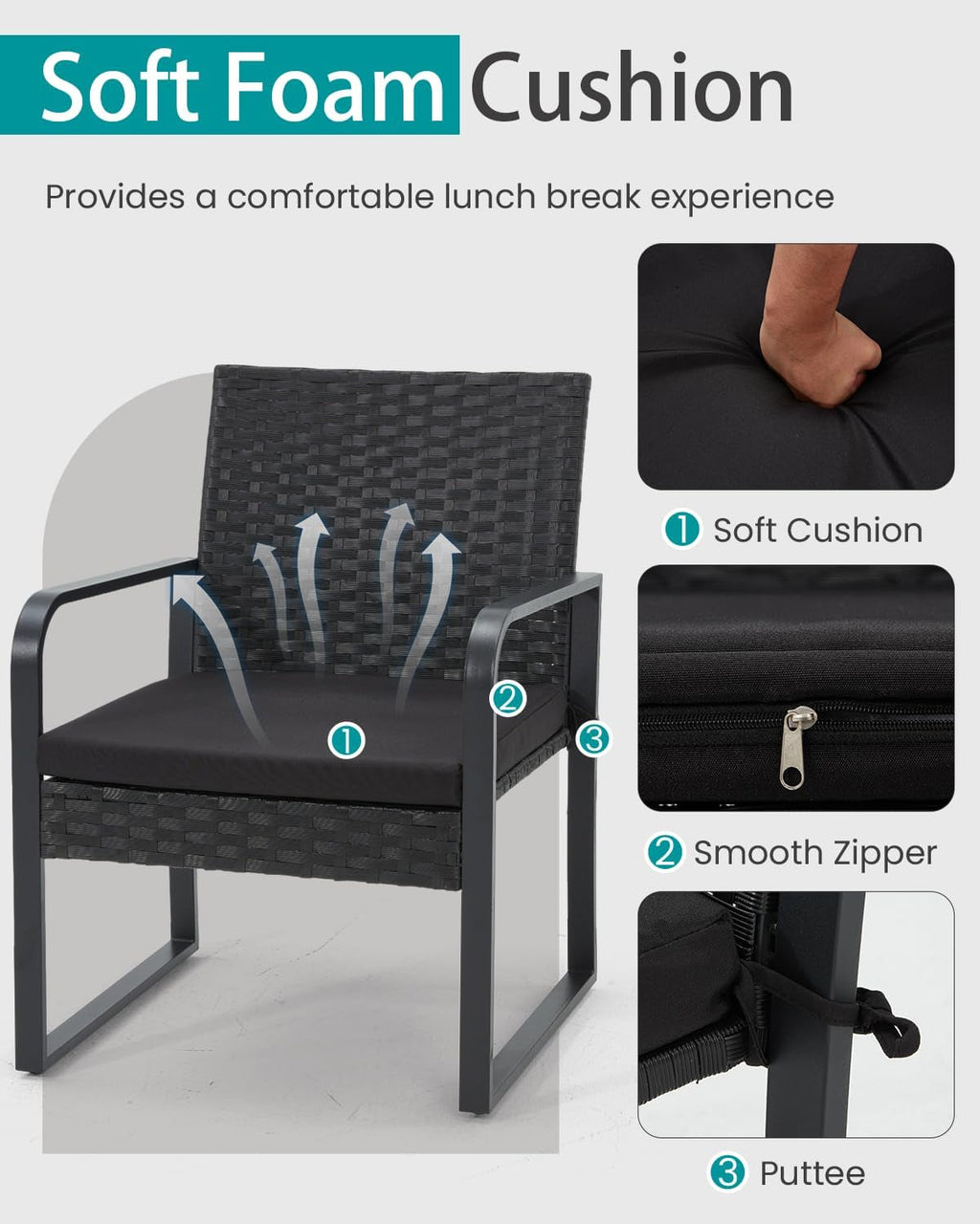 - Secure Cushions with Straps: Cushions attach to chair legs with adjustable straps to prevent slipping, keeping your seating neat and comfortable as you relax or entertain.