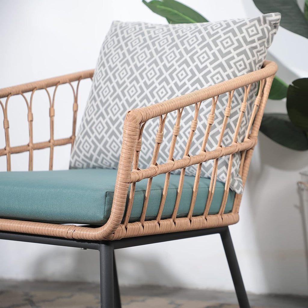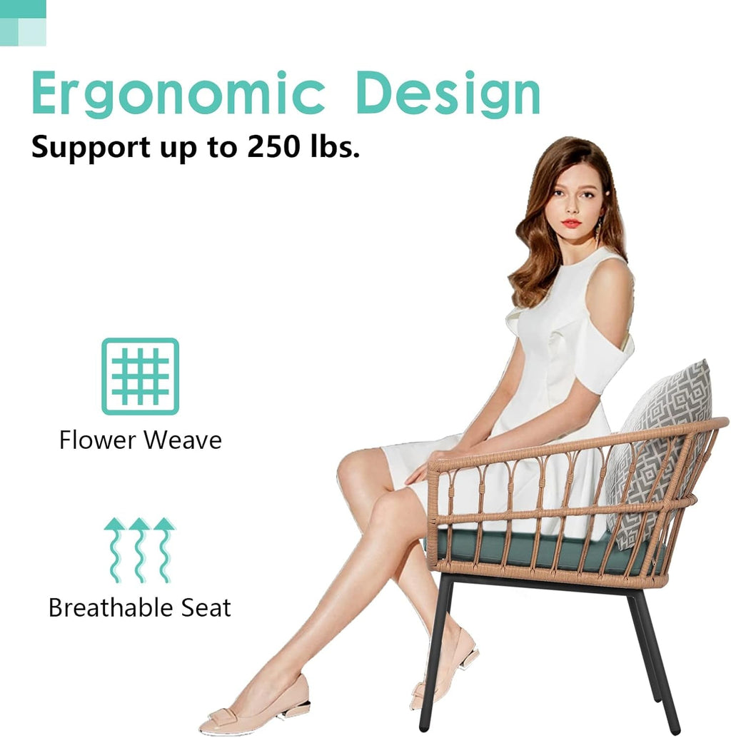 Transform your outdoor space into a stylish, all-season retreat with the 3 Piece Patio Furniture Outdoor Conversation Bistro Set in green. This inviting trio combines two extra-wide wicker chairs, a sturdy tempered-glass coffee table, and plush cushions to create a cozy, indoor-like feel outdoors for lounging, chatting, and entertaining.