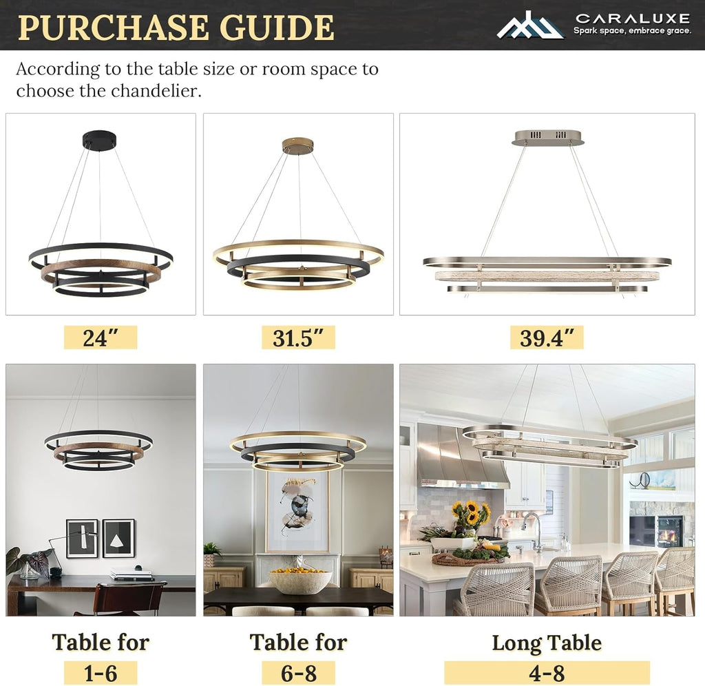 Elevate your space with a chandelier that blends farmhouse warmth and modern edge. The Matte Black Triple Ring LED 24-Inch Chandelier Fixture features a wood-printed central ring flanked by two sleek black rings, creating a versatile centerpiece for entryways, dining rooms, living spaces, bedrooms, foyers, and bathrooms.