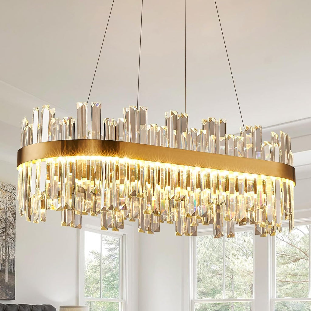Elevate your space with a 39.3-inch gold crystal chandelier that blends contemporary luxury with timeless brilliance. The sleek gold metal frame supports clear K9 crystals for a dazzling centerpiece that enhances dining rooms, living rooms, kitchens, and hallways with refined elegance.