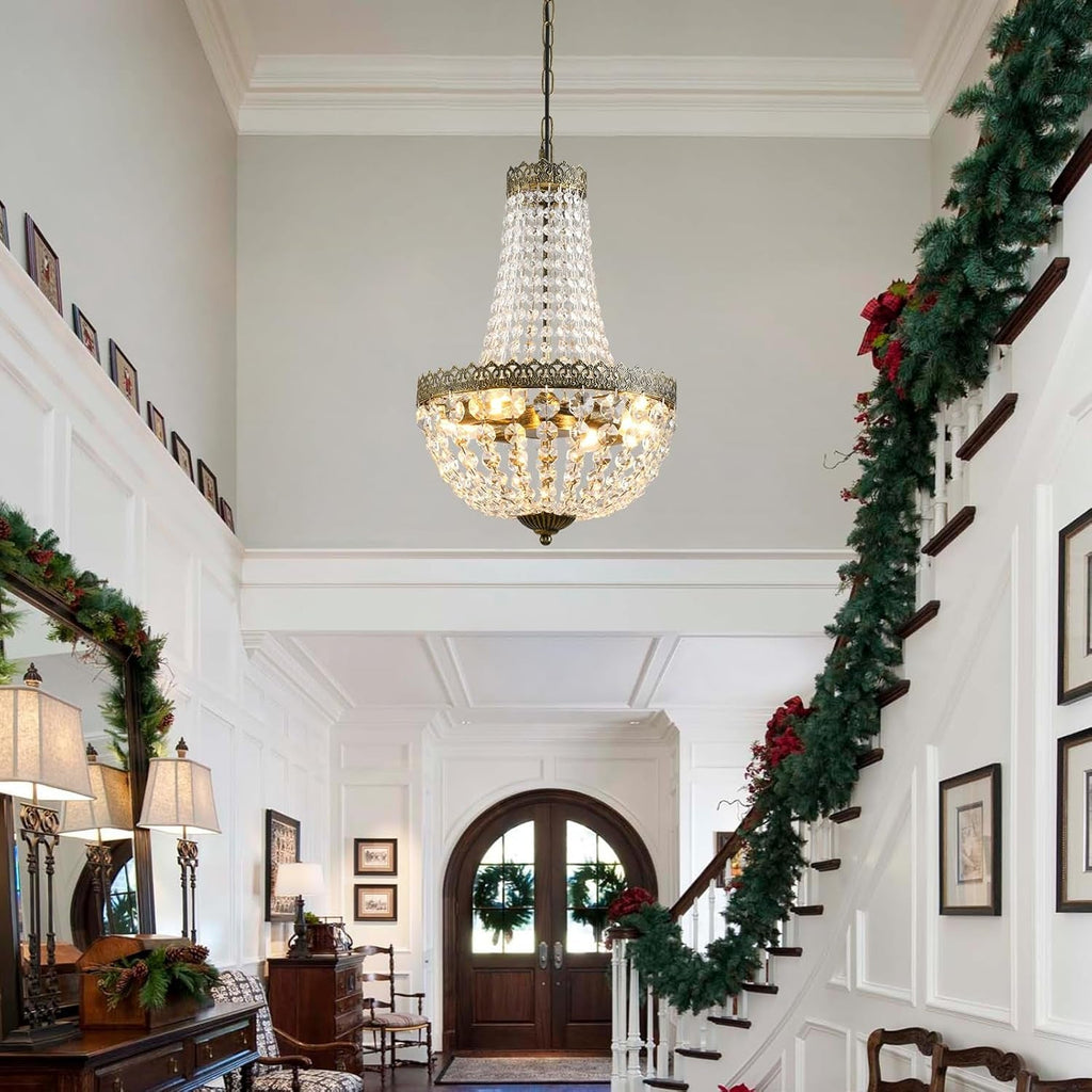 Elevate your space with a petite French Empire crystal chandelier—where antique elegance meets sparkling, modern clarity. This four-light fixture uses a bronze finish and cascading K9 crystal beads to create a diamond-like glow that instantly elevates dining rooms, kitchens, bedrooms, or entryways.