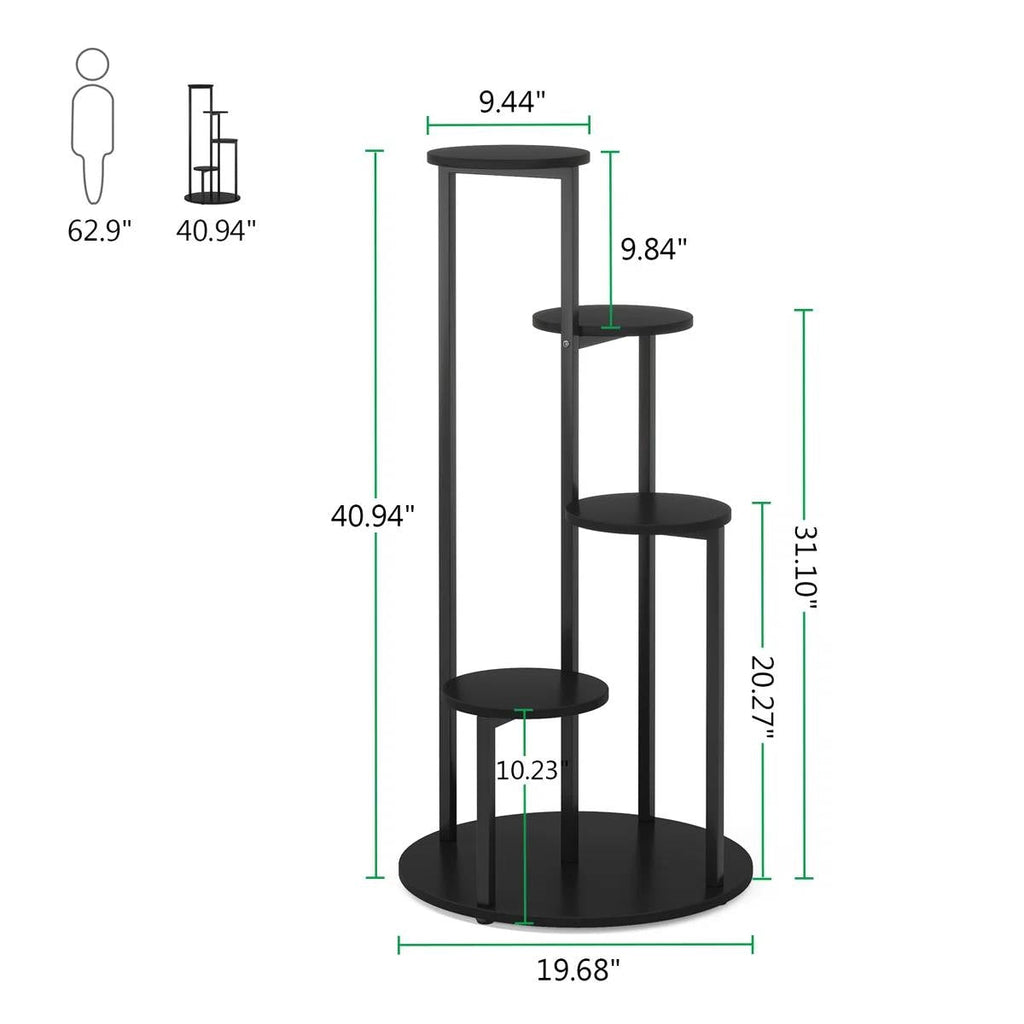 This 5-Tier Indoor Plant Stand with Black Metal Frame and Brown Wood Finish Shelves can hold 4 plants at the same time. High and low-tier plant table with opening designs allows each plant to get enough sunlight for growth without shelter. Each tier of the plant stand indoor can bear 30 lbs. Made of E1 particle board with a powder-coated metal frame, place them in a humid environment, with no rust, and has a long-lasting life. This tall plant stand for multiple indoor plants, is a beautiful and creative gift, adding a touch of nature and elegance to living room, bedroom, porch, etc. Ideal for plant enthusiasts, it brings the joy of gardening indoors, making it a unique and enduring present for various holidays.