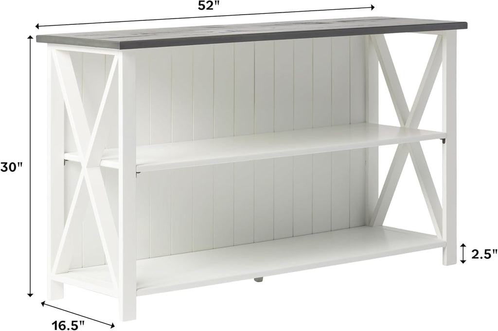Designed for practical, everyday use, this two-tier storage unit combines durability with thoughtful style. A beadboard backer and X-shaped sides add classic farmhouse character, while the two exterior shelves and a fixed interior open shelf provide flexible storage for books, decor, and office supplies.