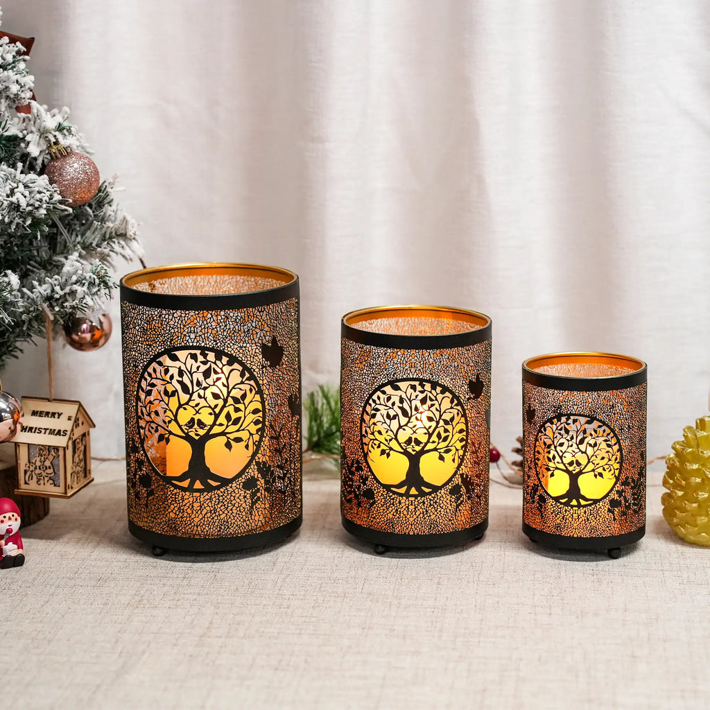 šćChristmas Decorative Lanternć: This set of Christmas Lanterns is crafted from high-quality wrought iron and features an Etched design featuring classic holiday elements like trees and birds. When lit, they cast captivating light patterns, instantly infusing any space with a warm, magical Christmas atmosphere and complementing your holiday decor.