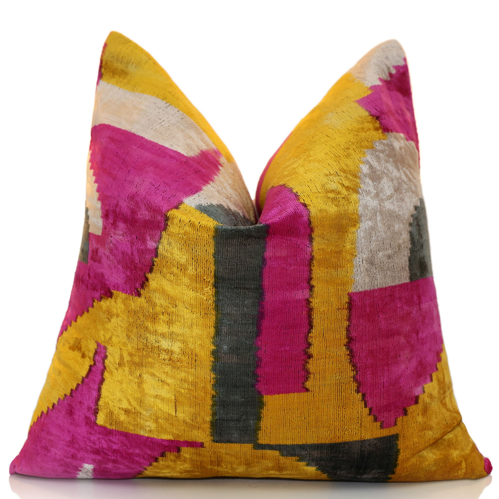 his handcrafted 20x20 inch (50x50 cm) silk velvet throw pillow is a statement piece designed for elevated interiors. Hand woven and hand knotted using organic vegetable dyes, this pillow showcases a bold abstract composition in rich golden ochre, fuchsia pink, soft ivory, and charcoal gray. The naturally luminous silk velvet surface creates depth, texture, and movement, making each pillow a one-of-a-kind textile artwork.