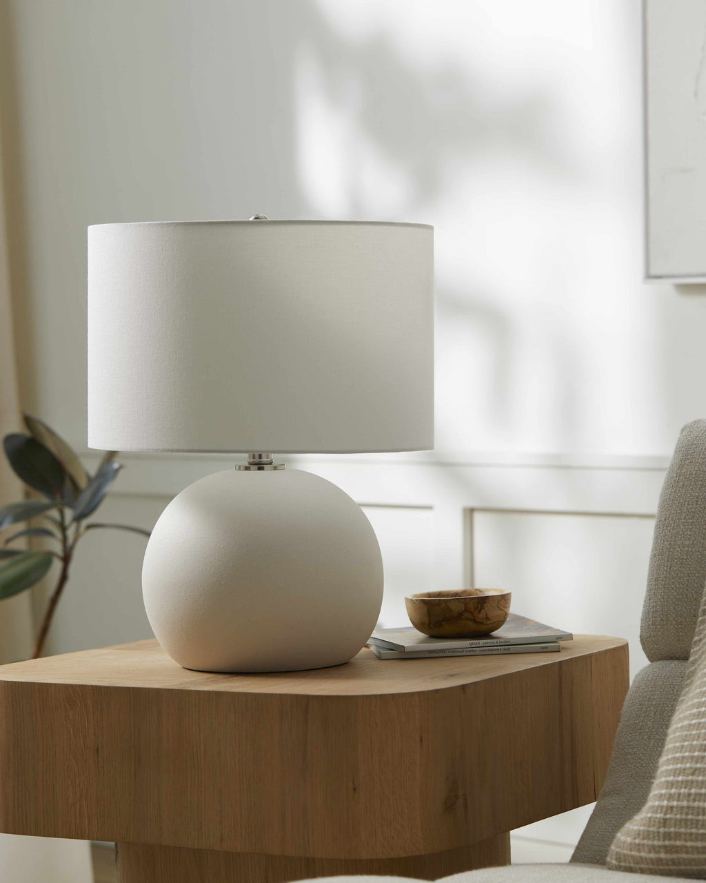Material: Body: Ceramic / Base: Ceramic / Shade (Outside): Linen / Finial: Iron |