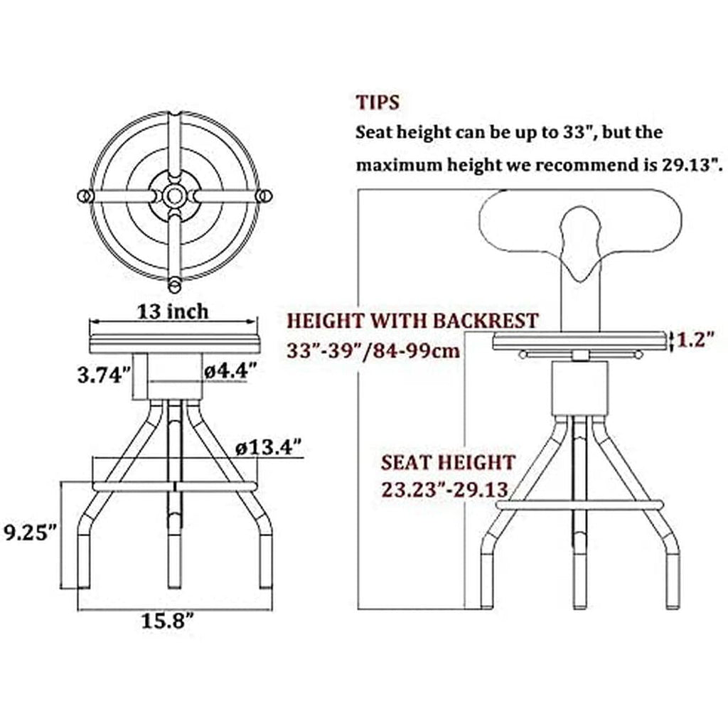 | DESIGN:bar height;counter height;height adjustable;swivel seat; with footrest;with backrest;armless | OCCASIONS: Kitchen/Living room/Dining room/Sun room/Patio/Bistro/Coffee House/Office/Residential APPLICATIONS: Bar Stool;Kitchen Stool;Dining Stool;Farmhouse Stool;Coffee Chair | There may be a little color difference due to differences in display and brightness. If you sit on it and turned it continuously, it will be somewhat loose, especially if it is turned counterclockwise, the looseness will be the biggest. In this case,just screw the nuts by the handle again to lock. Once assembled, rotate the seat up and down multiple times outdoors or on a drop cloth to allow the grease to drop off prior to using in on your flooring. |