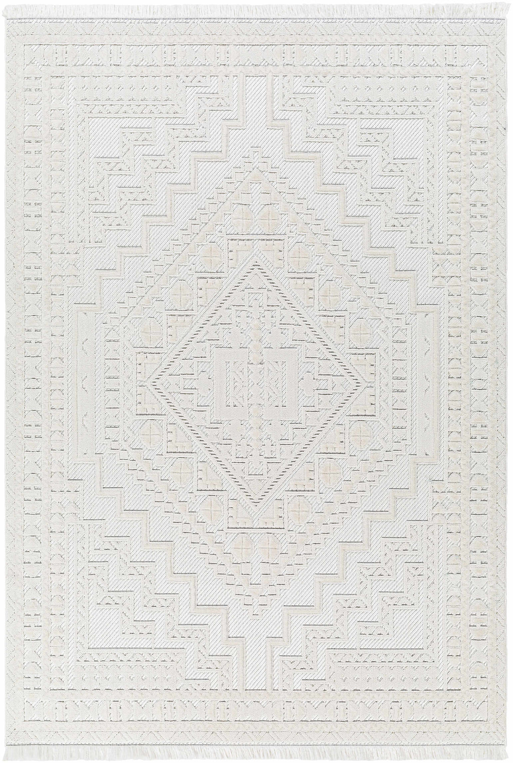About: The Ivory Alya Textured Medallion Fringe Area Rug combines high-low textures with elegant medallion patterns, offering a luxurious feel underfoot. This rug seamlessly blends traditional and modern decor, making it a versatile addition to any room. Its crisp white color serves as a focal point, bringing a sense of cleanliness and brightness to your space. Whether placed in your living room, bedroom, or hallway, this rug adds both comfort and style. The fringed edges enhance its sophisticated look, while its plush texture ensures every step feels inviting. Perfect for creating a balanced, stylish atmosphere in any home.