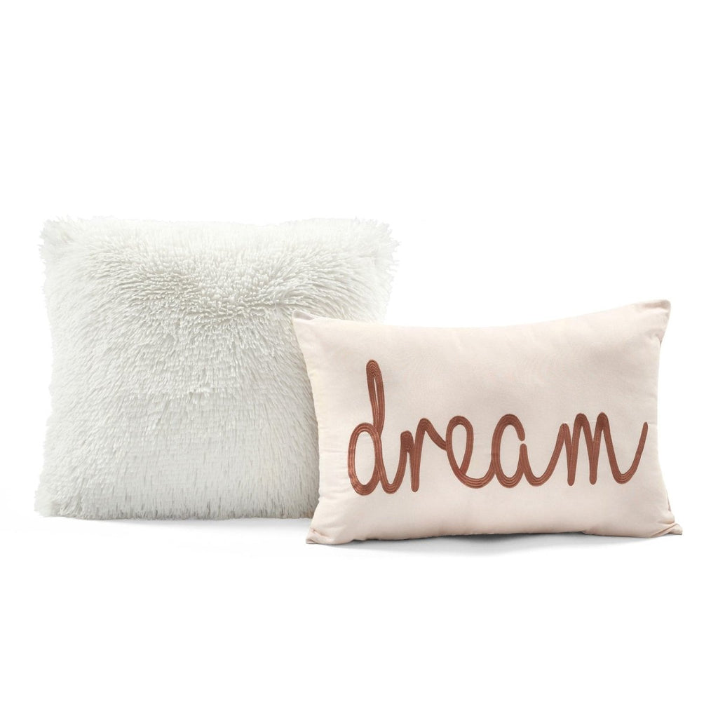 The rectangular decorative pillow features the word Dream embroidered on the front. The square decorative pillow is an off-white faux fur pillow for added texture and coziness.