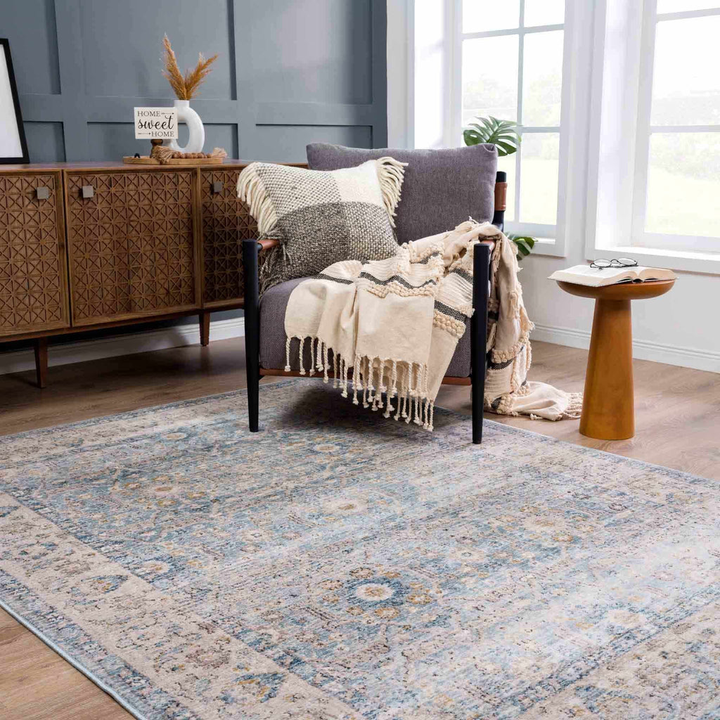 About: The Anana Silver Blue Beige Area Rug features beautiful tones of Blue and Beige, capturing a distressed and traditional style reminiscent of Turkish and Anatolian rugs. Its intricate design adds a touch of timeless elegance to any room, making it a versatile choice for classic and modern interiors alike. Perfect for creating a warm and inviting atmosphere in your home.