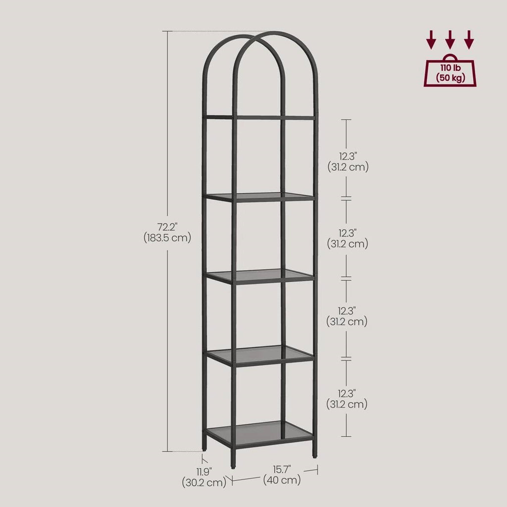 - Arched Top Black Metal Display Rack Narrow Bookcase with 5 Glass Storage Shelves
