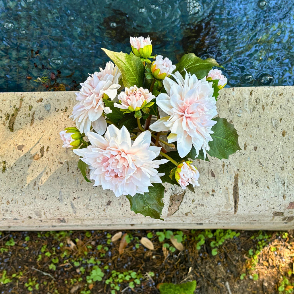 - 3 gorgeous silk dahlias soft ,elegant dusty peach
