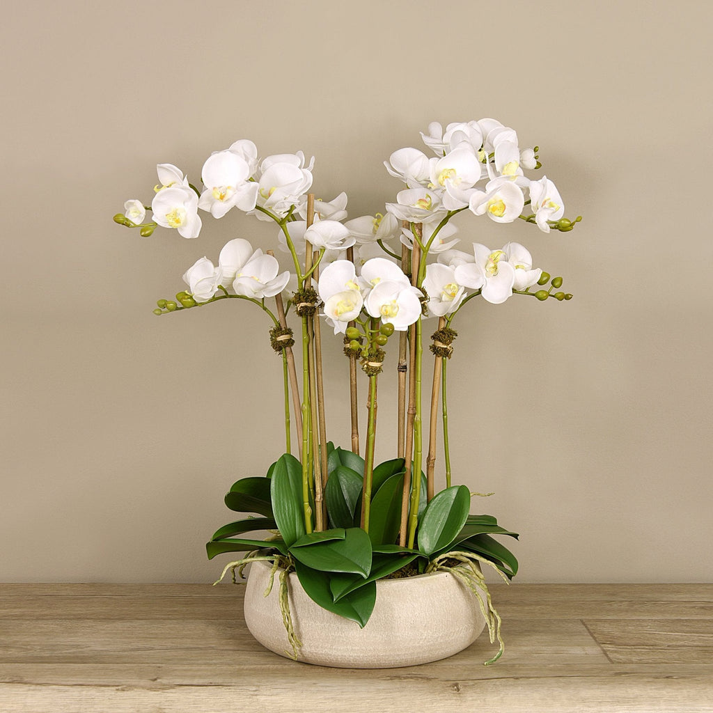 Stunning artificial orchid arrangement with white orchids displayed in a beige planter; ideal centerpiece arrangement to flaunt in the formal living or dining room. This luxury artificial orchid arrangement adds a grandiose and affluent flare to your space.