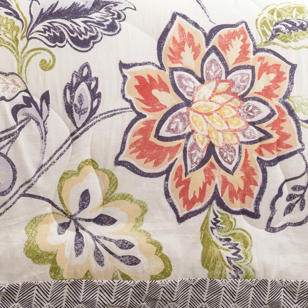 Our Aster Comforter 5 Piece Set features a delicate floral engineered pattern on micro fiber. This soft comforter set will add life to any bedroom with its bright pastel colors and large blooms with a full navy geometric border.