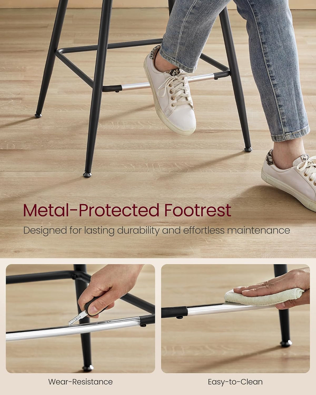 - Durable steel frame with a metal footrest and protective touches for easy cleaning and added longevity.