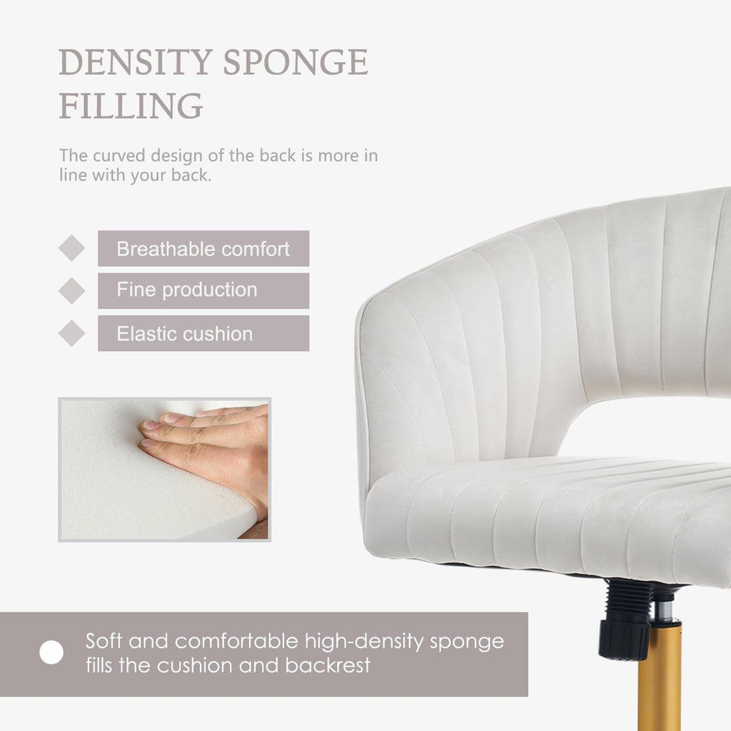 Transform your space with luxury, comfort, and 360-degree versatility—the velvet home office chair that elevates every moment. The beige velvet upholstery invites you to sink in, while the polished gold base adds a touch of refined glamour to any room—whether it’s your desk, vanity, living room, bedroom, or study.