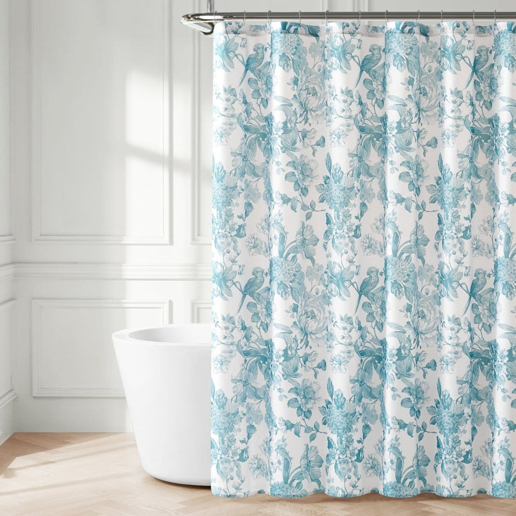 Make a statement with your decor by adding this vintage inspired toile shower curtain. This bath curtain is printed with birds and flowers and easily adds color to your space. Made with a linen textured fabric, it fits great with vintage or cottage decor. It measures 72 wide inches by 72 inches long. Installation is easy with 12 button holes at the top to hang with shower hooks or rings. Pair this fabric shower curtain with a liner, sold separately. Machine washable for easy care.