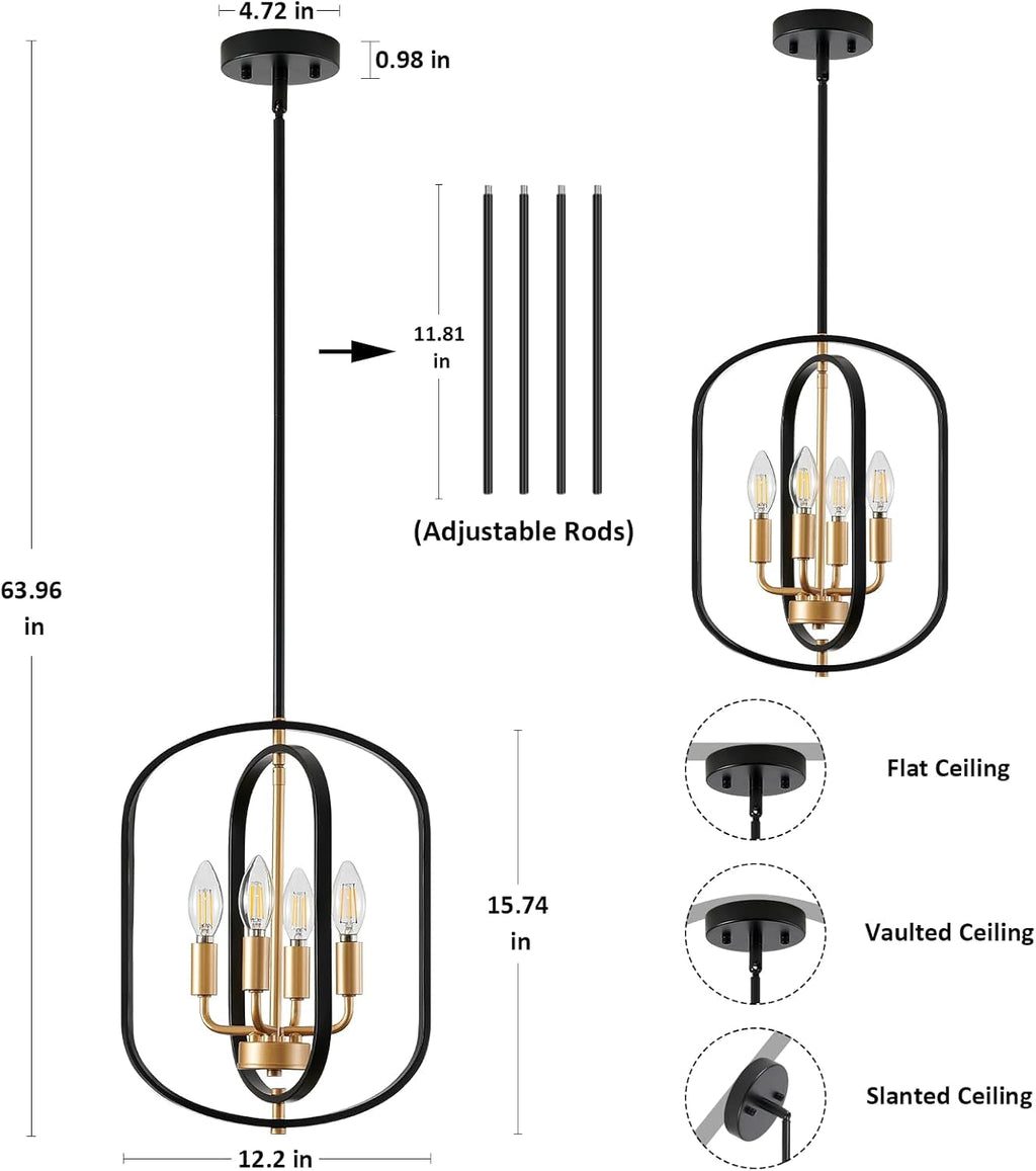 Designed for real living, this fixture answers common lighting needs: warm, inviting illumination without glare, plus a centerpiece that fits ceilings of various heights. The glass shade paired with a matte black and gold frame balances refinement with rustic charm, while the 4-light arrangement provides ample brightness for meals, gatherings, and everyday moments.