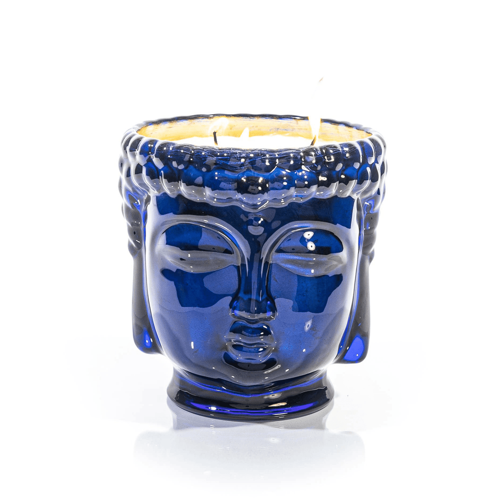 24K Gold Sapphire Blue Glass Buddha Royale: Transport yourself to the world of ancient royalty with the Thompson Ferrier Caesonia Sapphire Blue Glass Buddha Candle, lined with 24K Gold.