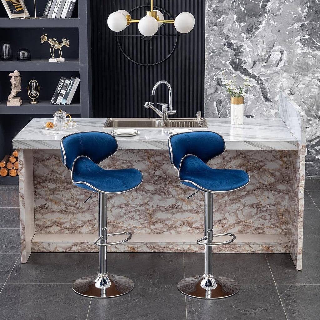 Elevate your home bar with the Masaccio Velvet Upholstered Adjustable Swivel Barstools — a 2-pack that blends luxe comfort, modern chrome, and effortless versatility. The plush blue velvet seating invites you to linger, while the built-in gas-lift height adjustment and 360° swivel keep conversation flowing.