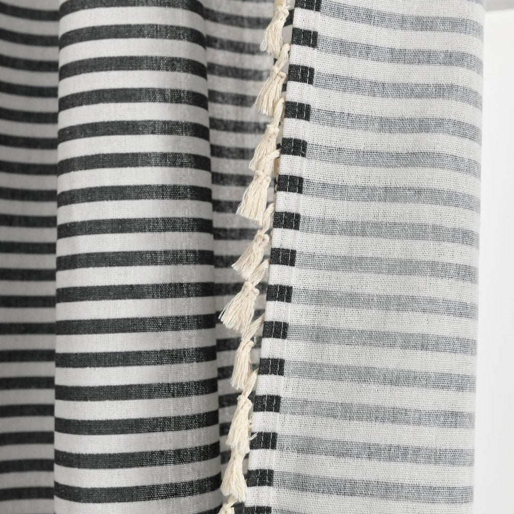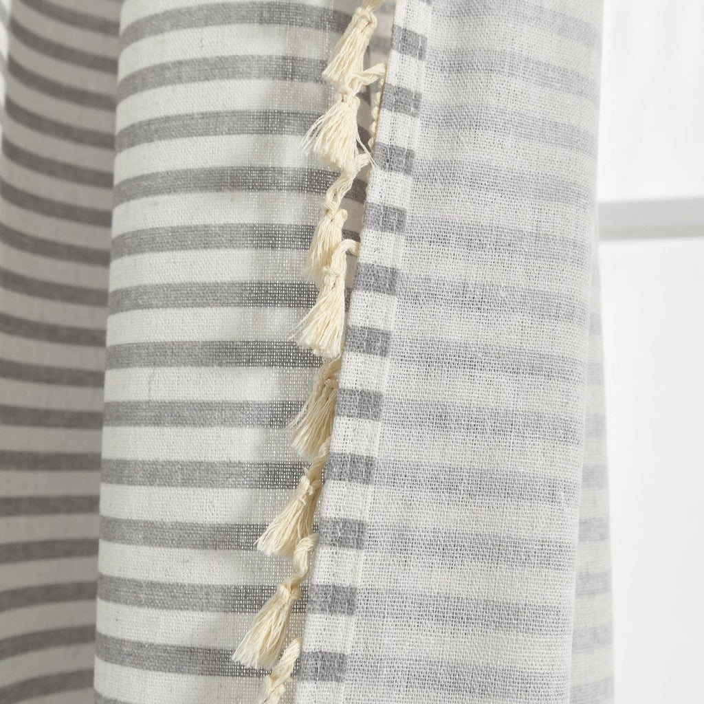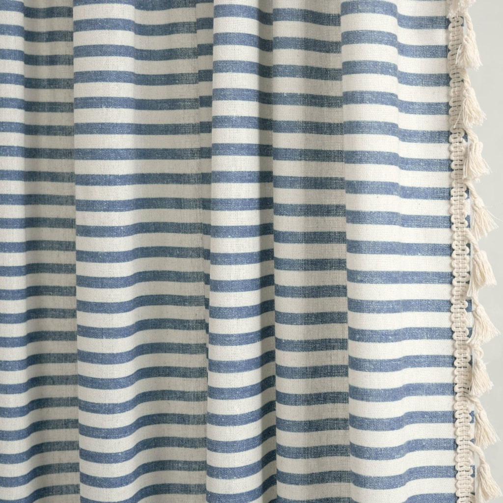 The length of each panel is lined with small tassels giving this set a versatile design . The Boho Coastal Horizontal Ticking Stripe Tassel Window Curtain Panel Set can fit into many different home styles, from coastal to hygge, farmhouse, boho and more.