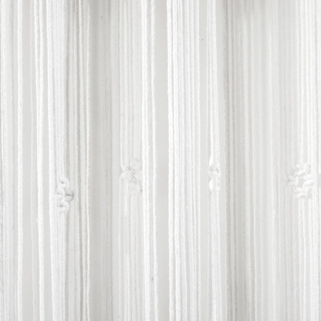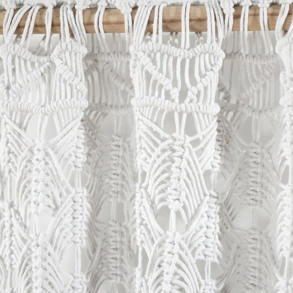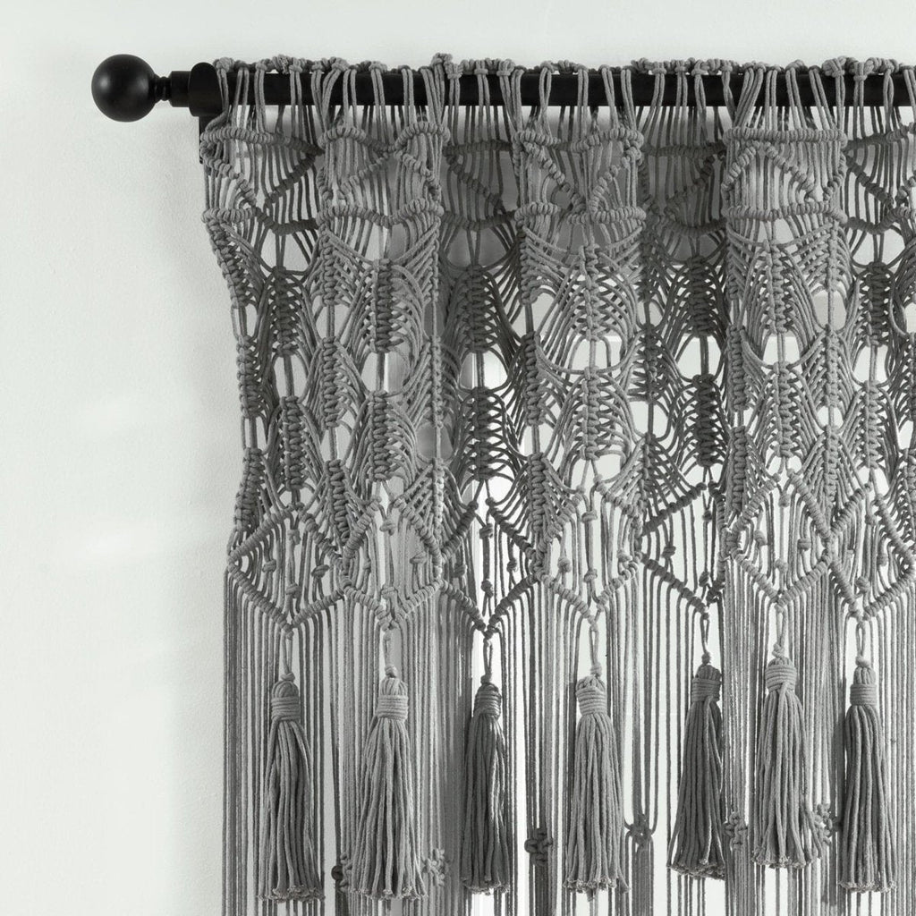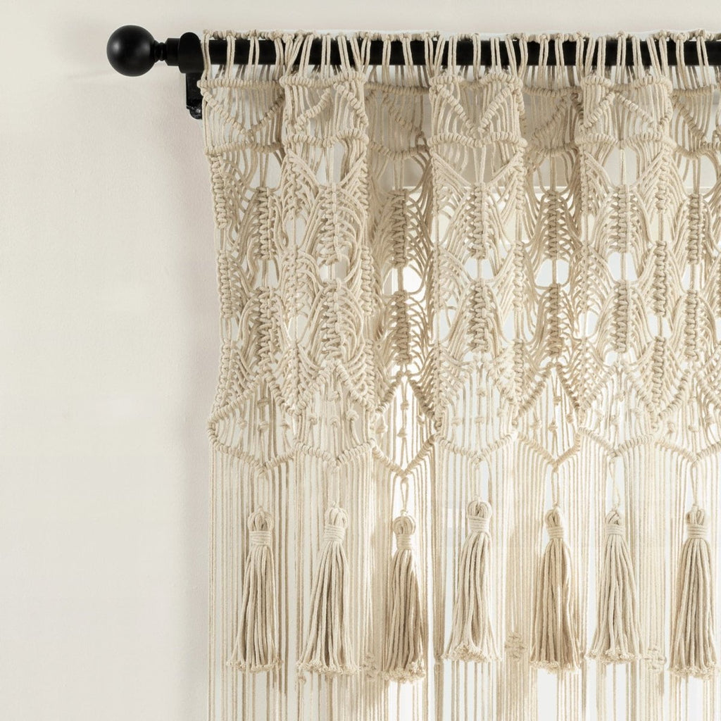 Create a textured boho look in multiple rooms of your home with the versatile Lush Decor Boho Macrame Tassel Cotton Window Curtain Panel. A macrame curtain featuring a beautiful hand-knotted pattern, detailed with large hanging tassels, will easily add visual interest to your space. Use this as a window curtain, doorway curtain, room divider, photo backdrop, or wall art. Macrame decor brings a relaxing, bohemian vibe into your home. Due to the open, woven design, this window curtain has a sheer opacity, letting in plenty of light. This handcrafted boho curtain is woven with 100% cotton rope. Seven tassels hang across the panel, each flowing approximately seven inches down. This curtain for windows measures 40 inches wide by 84 inches long, and is sold as a single window panel. This window panel offers seamless installation with its 3" rod pocket, easily slide it onto your curtain rod or by using clip rings (not included). Our Boho Macrame Collection is crafted and hand woven by an independent women's cooperative located in a small village in Parajat, India. This curtain is made with love and your purchase helps to support and empower these women makers and their entire village. To care for this cotton curtain we recommend spot cleaning and hanging to dry.