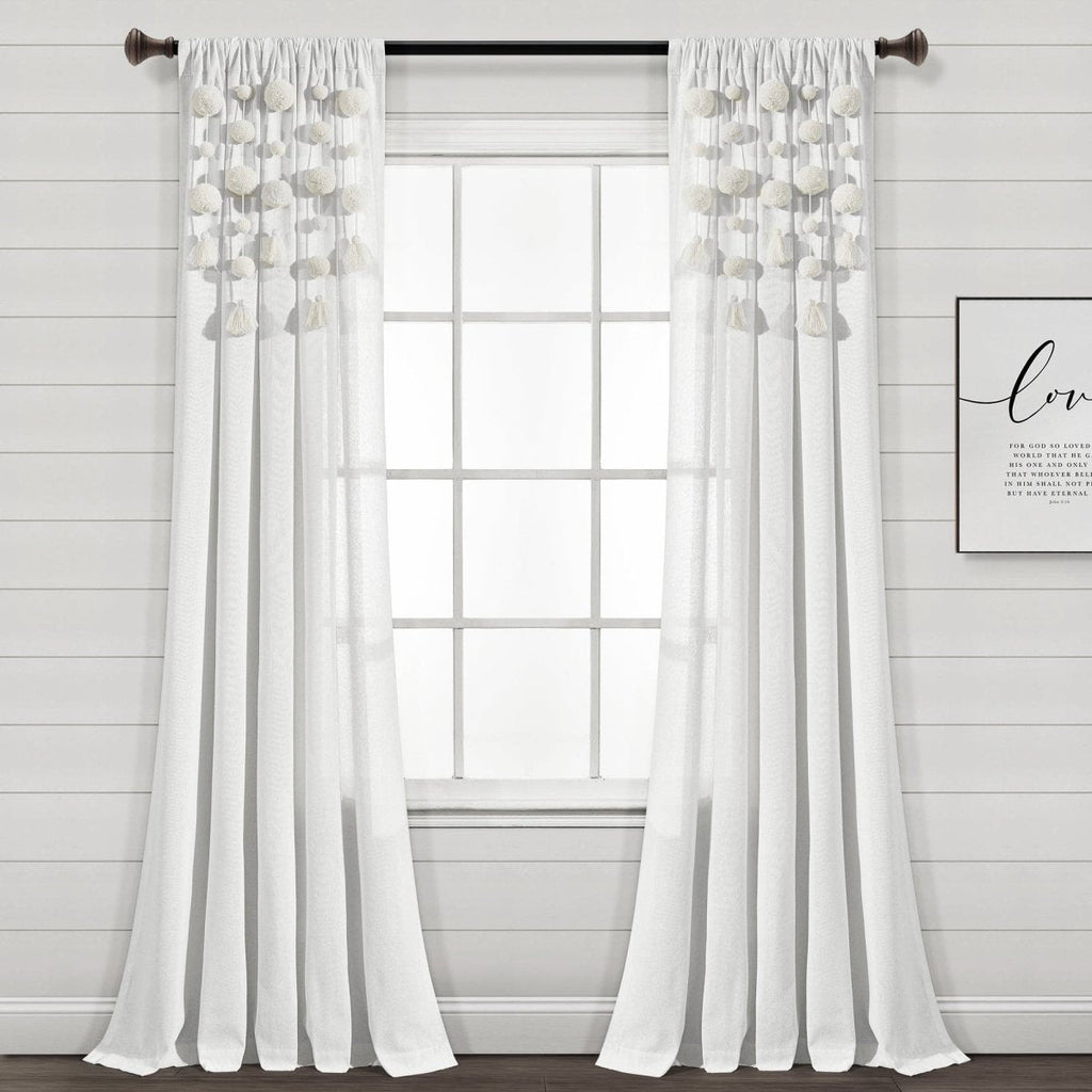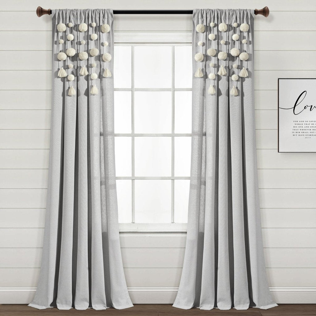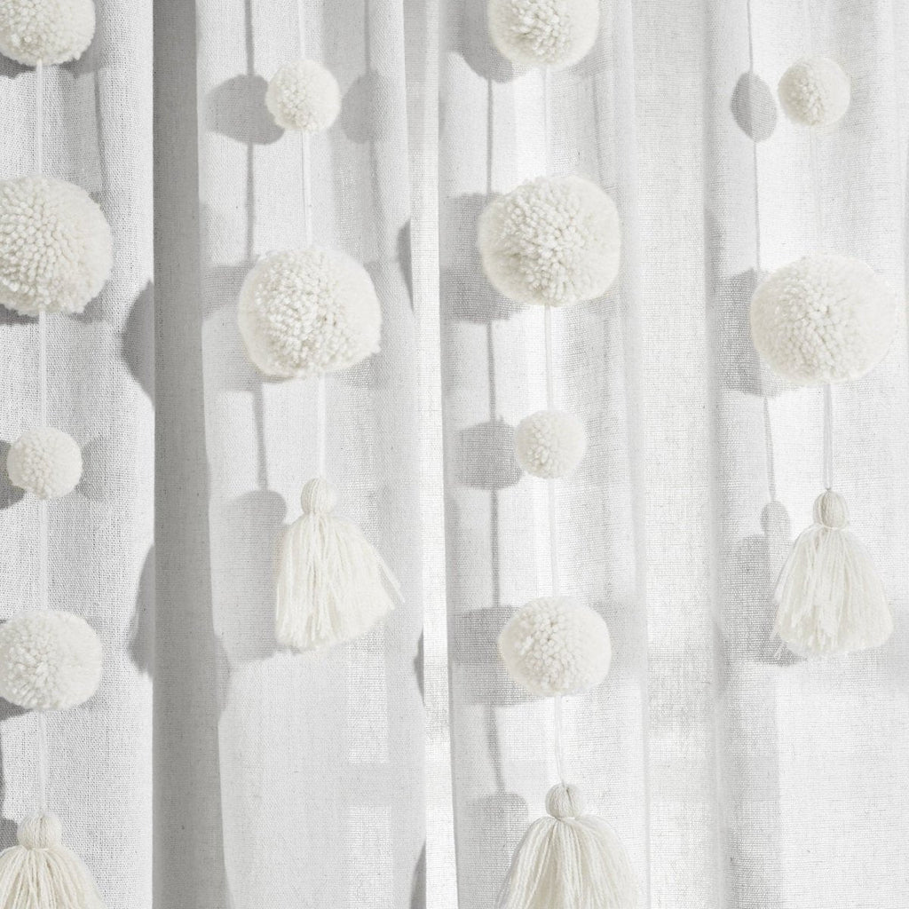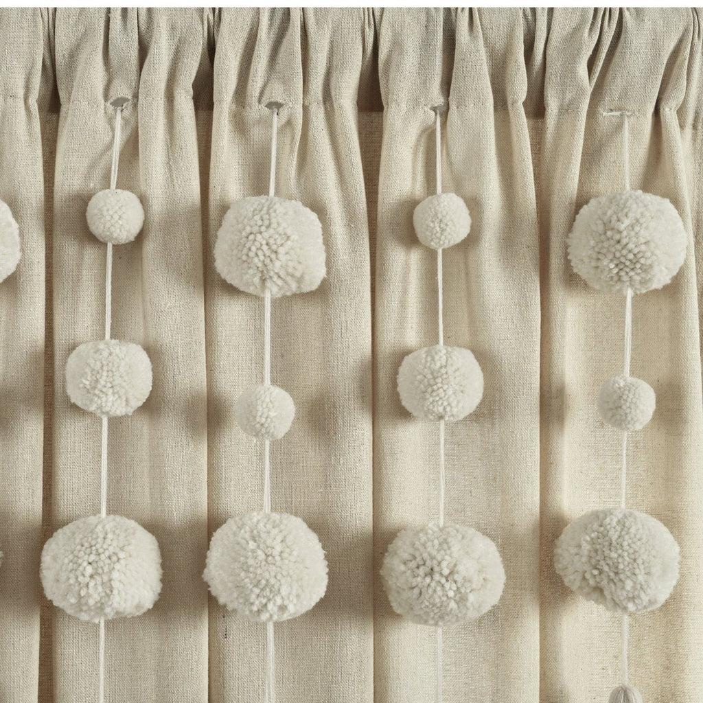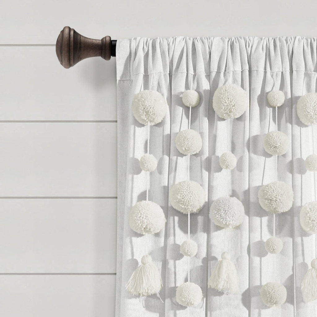 Dress your windows with fun and elegant style with this faux linen curtain featuring pom poms of various sizes cascading down the top portion of the panel. The pom pom tassels create a waterfall effect, creating a high fashion look for your home. Our Boho Pom Pom Tassel Faux Linen Window Curtain Panel is sure to turn heads in your space.