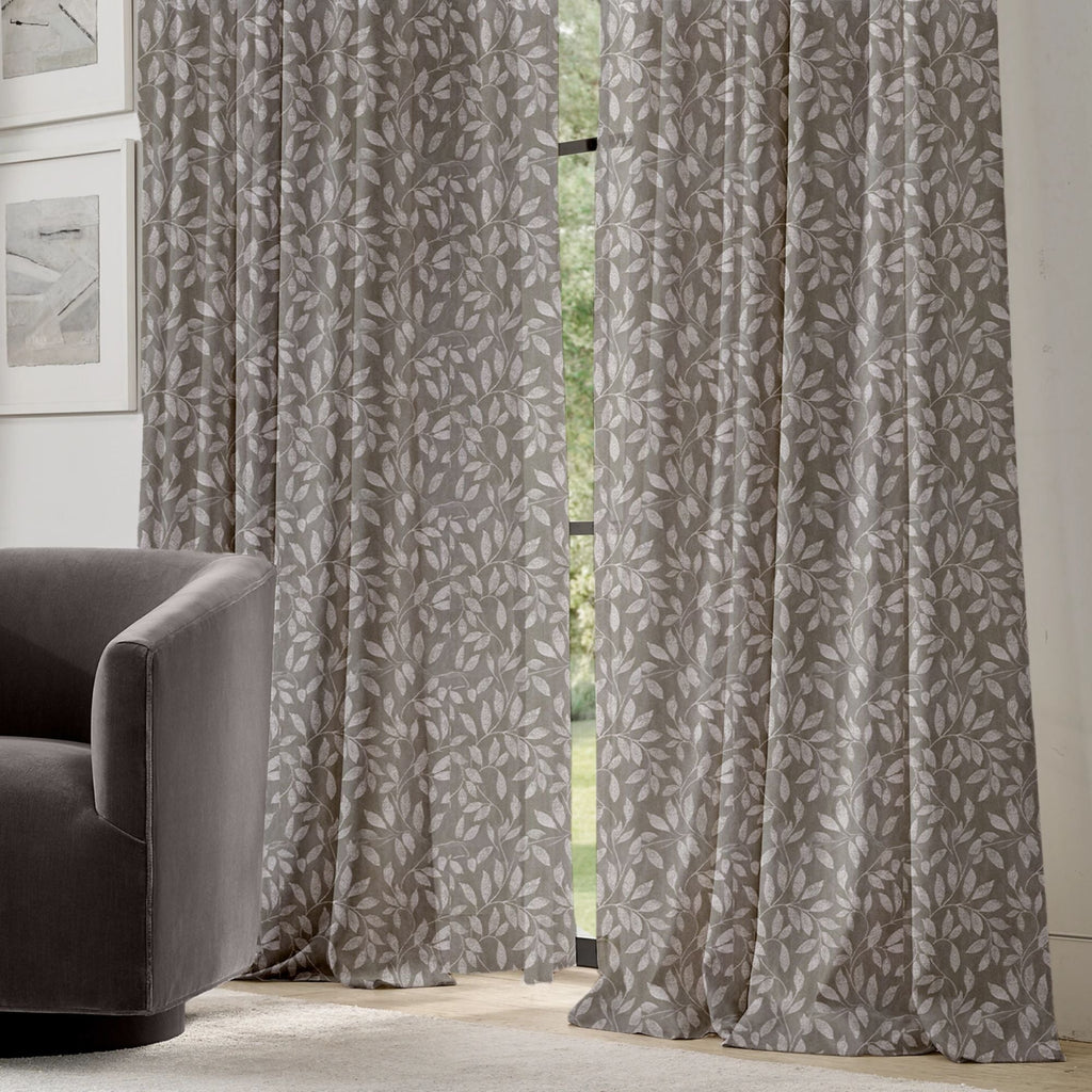 These curtains showcase a beautifully rendered **botanical pattern** featuring intertwining leafy vines or branches. The pattern is presented in a contrasting light neutral shade (such as off-white or light beige) which stands out against the base colour, adding depth and a sophisticated natural motif. The pattern elements possess their own subtle texture, enhancing the design's definition.