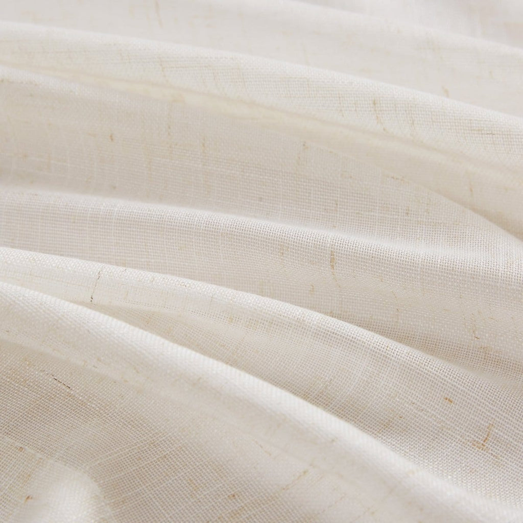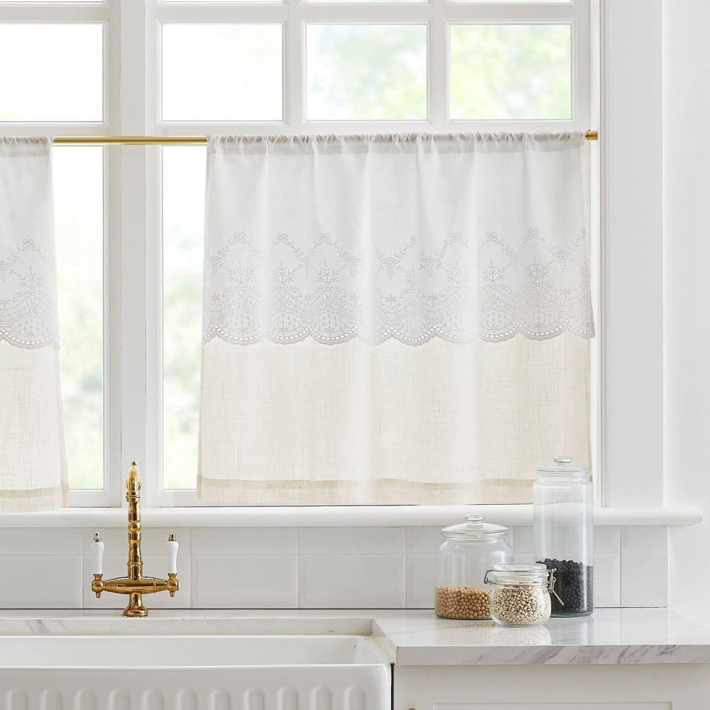 This charming kitchen tier set features an attached valance with eyelet embroidery and scalloped edges and is great in a country cottage style home. The cotton valance overlays a textured linen blend panel. These cafe curtains provide moderate privacy and allowing some light to pass through. Sold as 2 panels, each measuring 29 inches wide by 24 inches long. Easy to install with a 1.5" rod pocket, to slide onto a curtain rod or by using clip rings (not included). Machine washable for easy care.