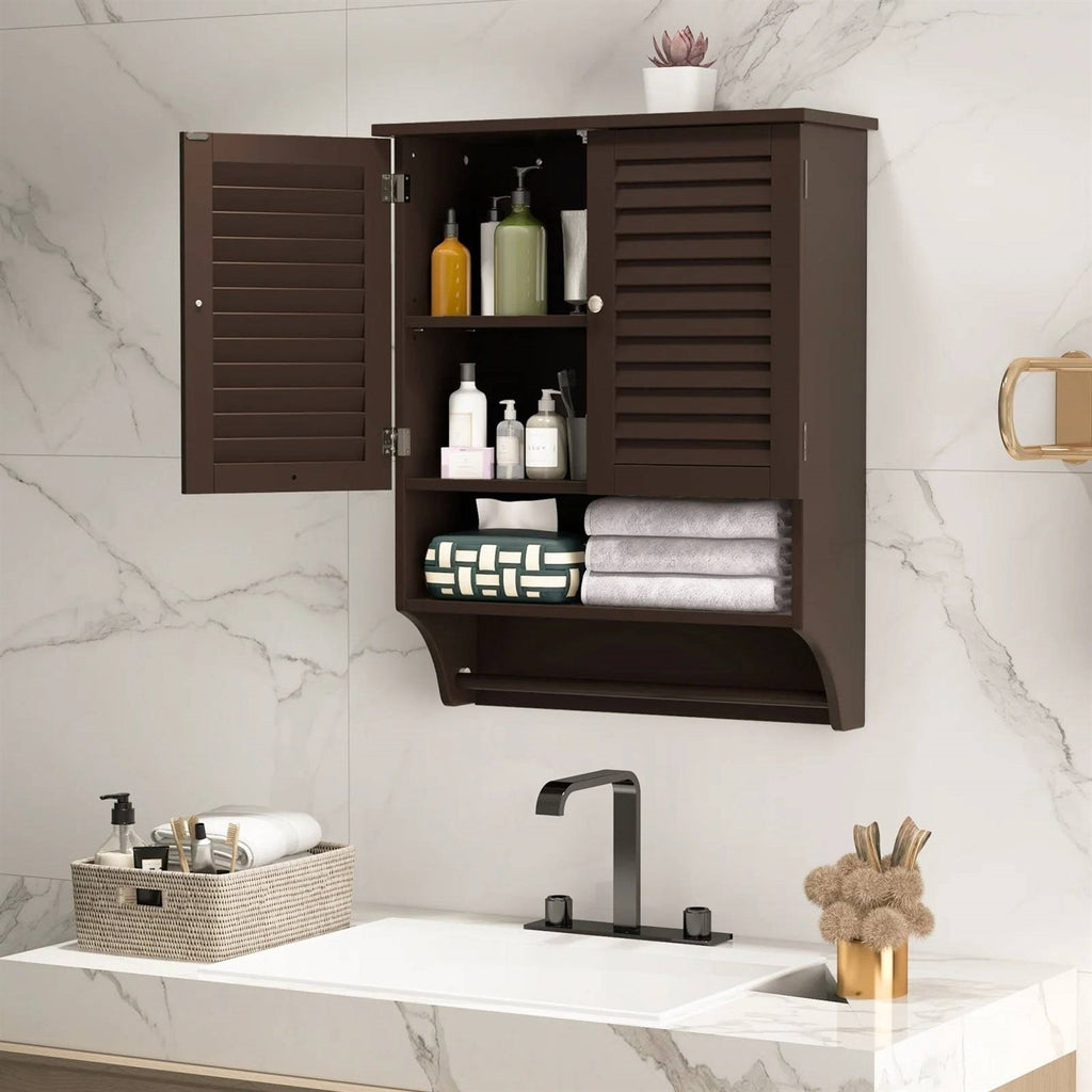 - Brown Wall-Mounted Bathroom Medicine Cabinet with Louver Doors and Towel Bar