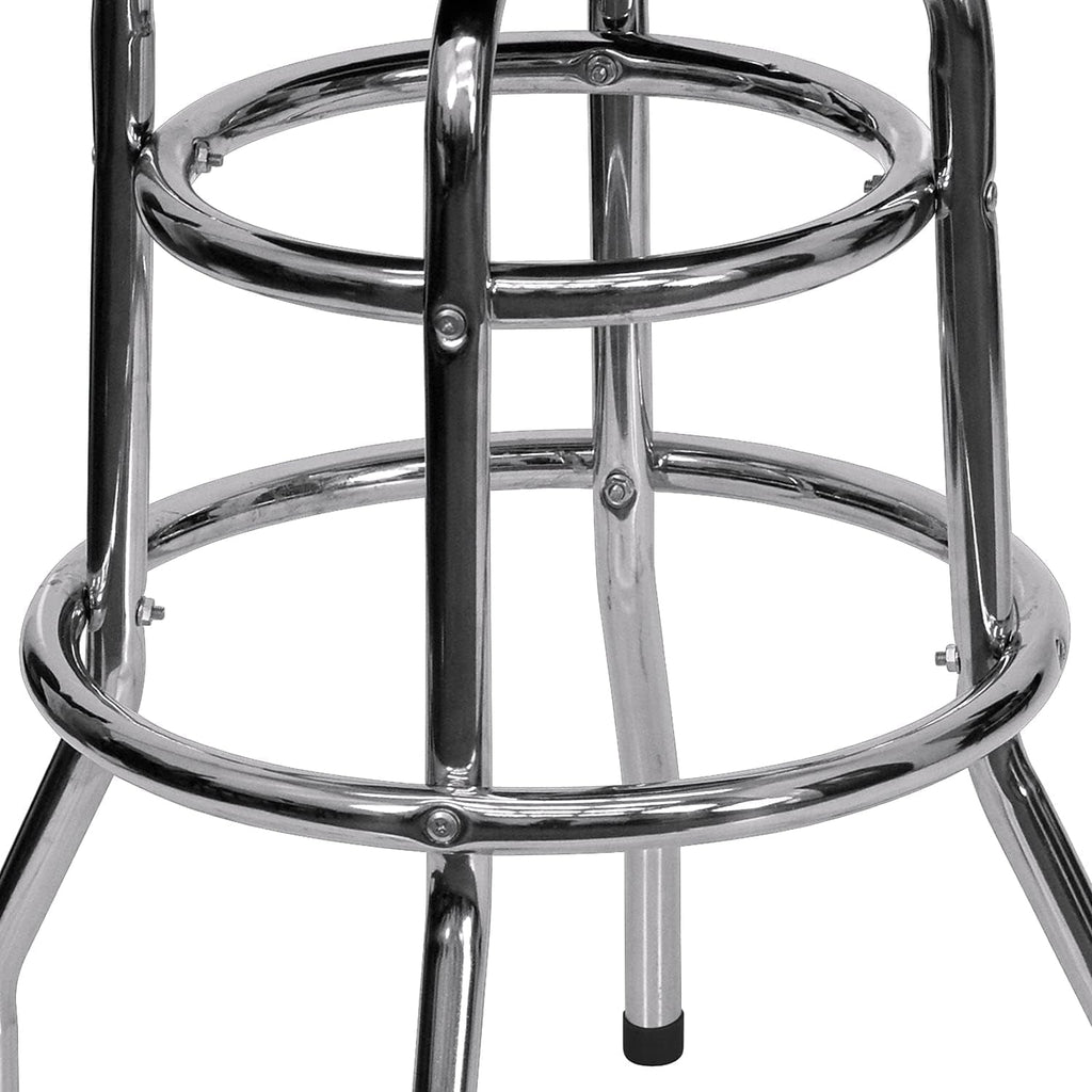 Engineered for versatility and lasting performance, these bar-height stools feature an 18-gauge steel frame for exceptional strength and stability, a swiveling round seat for easy access, and a distinctive double ring design that adds a touch of sophistication.