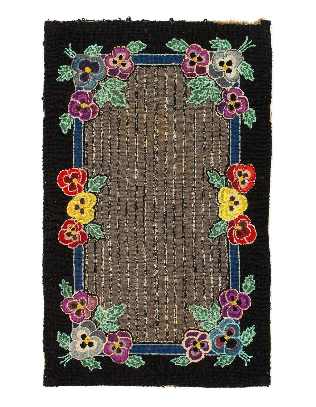 Antique Hooked Rug, United States, 1940 — Every element in this hooked rug border is sewn in a deep, rich Navy Blue with smaller, lighter lines throughout that create the illusion of a wooden surface. Winding buttermilk yellow and ruby red lines flow within and around each other, framing a sandy background that itself gives way to a diamond-shaped flow of fiery red flowers, with the base of their flow originating at every cardinal direction. At the center of these flowers rests a simple four-pointed star, that creates contrast in this antique rug.