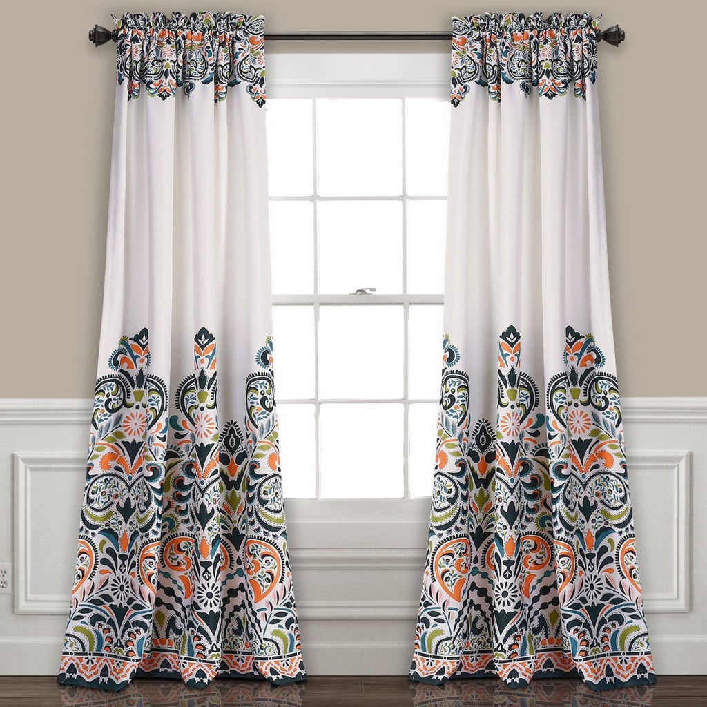 The Clara Light Filtering Window Panel Set features a stunning design, which is perfect for a master bedroom, guest bedroom, living room, den or dining room. They are available in your choice of yellow and gray, turquoise and tangerine, blue and green, or navy and tangerine. They are available in 45 inches, 84 inches and 95 inches in length, and each panel is 52 inches wide with a 2-inch header.