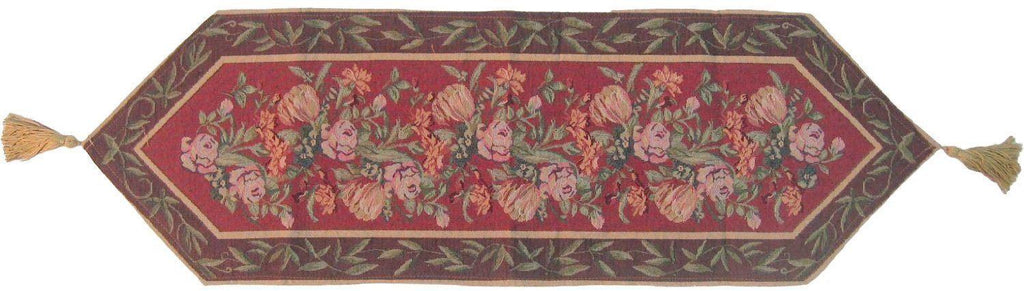 DaDa Bedding's Field of Roses Table Runner - Bright Vibrant Intricate Colorful Floral Beige Tan Brown Ruby Burgundy Red Print with Golden Tassel Ends