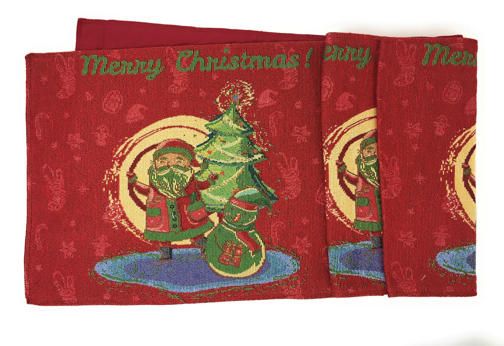 Brighten up your dining table with our one of a kind vibrant red "Merry Christmas" Santa Clause DaDa Bedding table tapestry sets this holiday season.