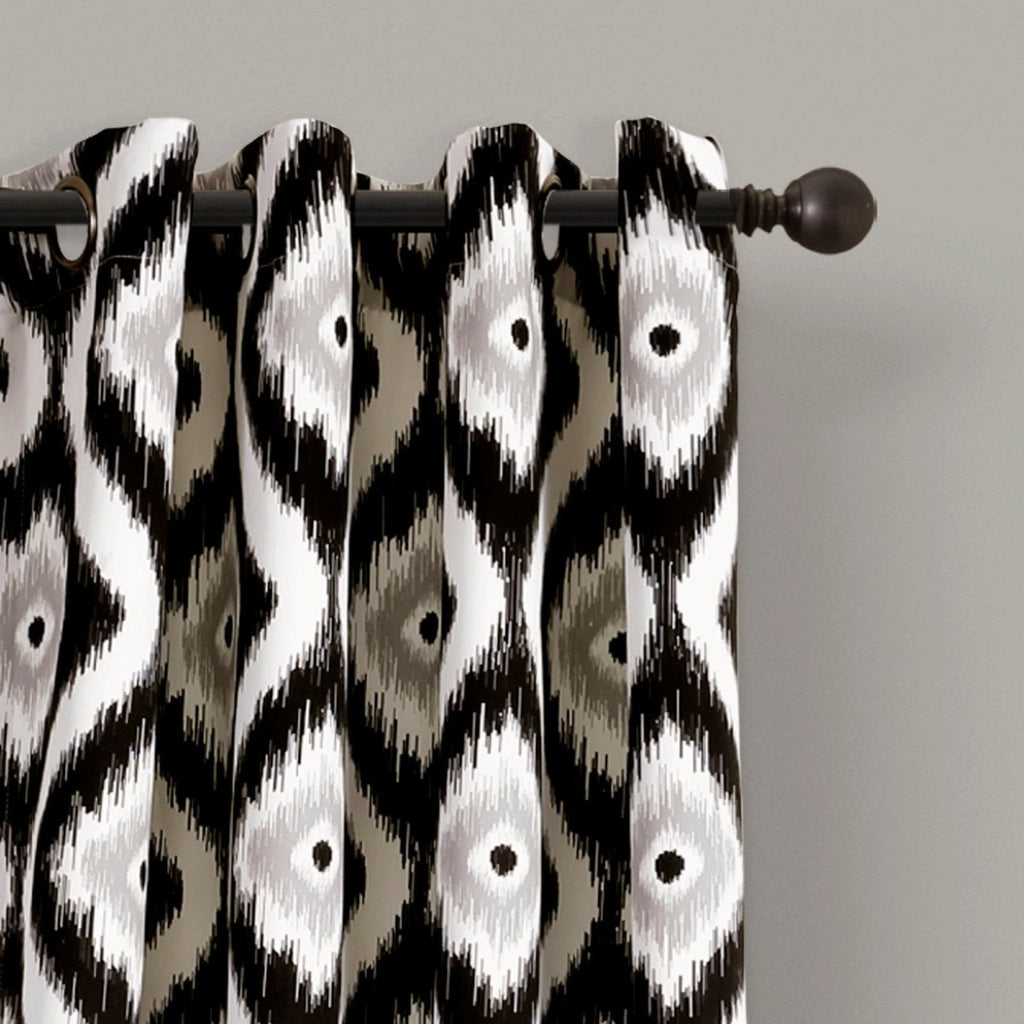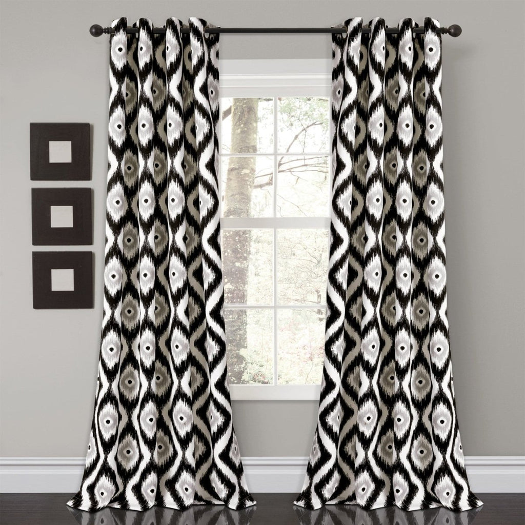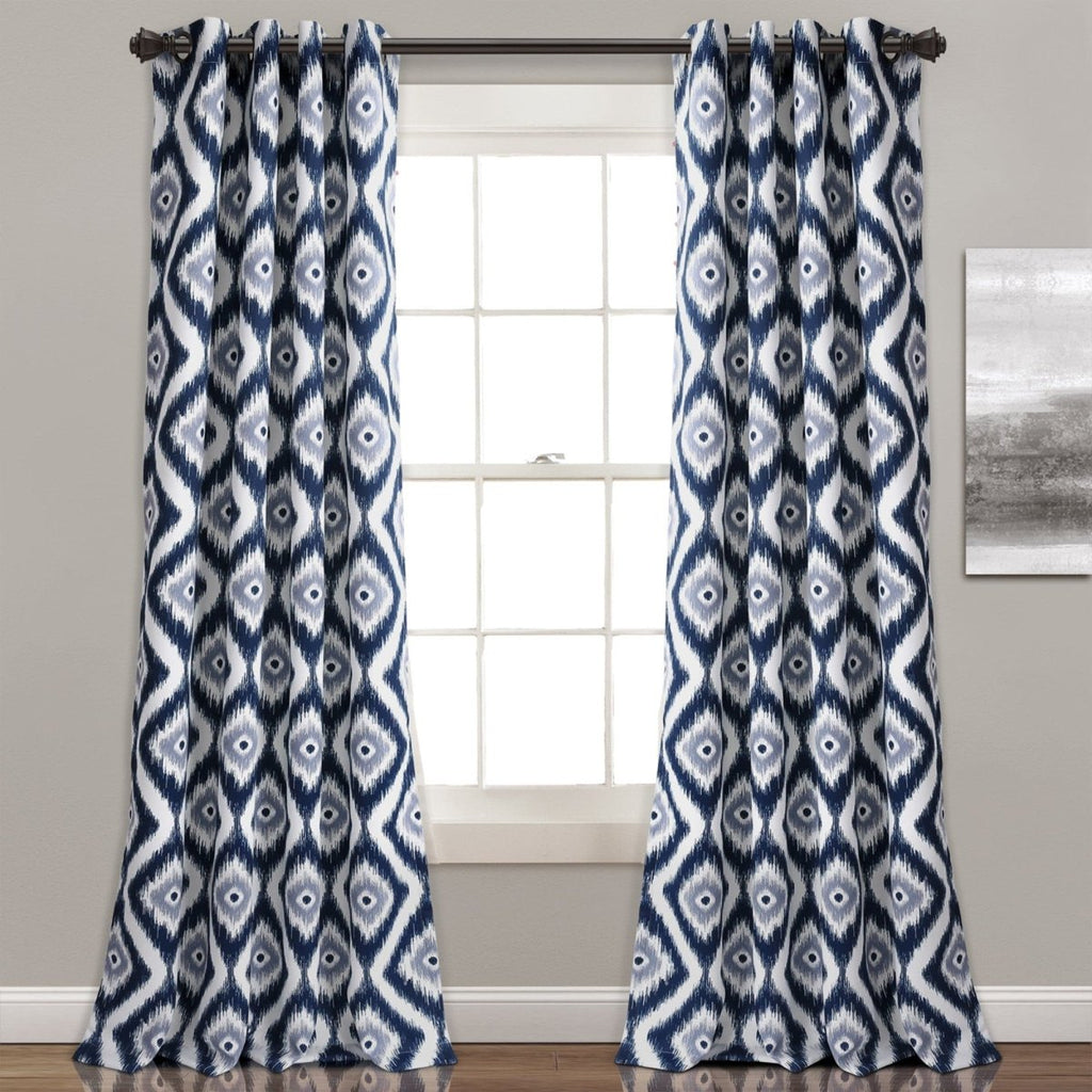 When you purchase the Diamond Ikat Light Filtering Window Curtain Set, you will receive two fashionable window panels. Each panel measures 84 inches in length and 52 inches in width. This style is available in four color options, including yellow, orange, black and navy. Each color sits against pure white backing.