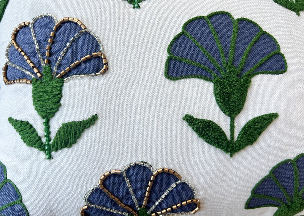 - Design: Features intricate embroidery and beadwork, and a contrasting navy border