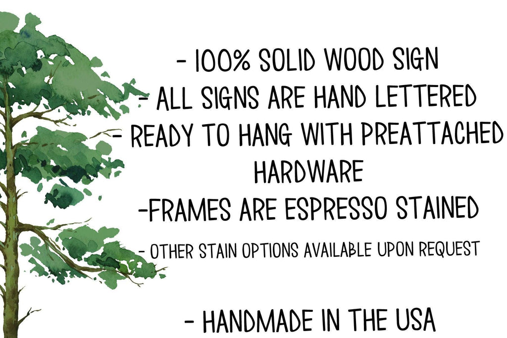 PLEASE NOTE- These are handmade and both the frame and the sign itself are wood. Each sign is hand lettered and may differ slightly from the picture. It is impossible to duplicate a sign. Due to the character of wood, sometimes knots or imperfections are present. We feel that slight imperfections help add to the character of our handmade signs. Back of sign is unpainted. The natural variations in wood products include, but are not limited to... wood grain pattern, color variations, hairline cracks, small dents or scratches, knots, and/or mineral streaks.