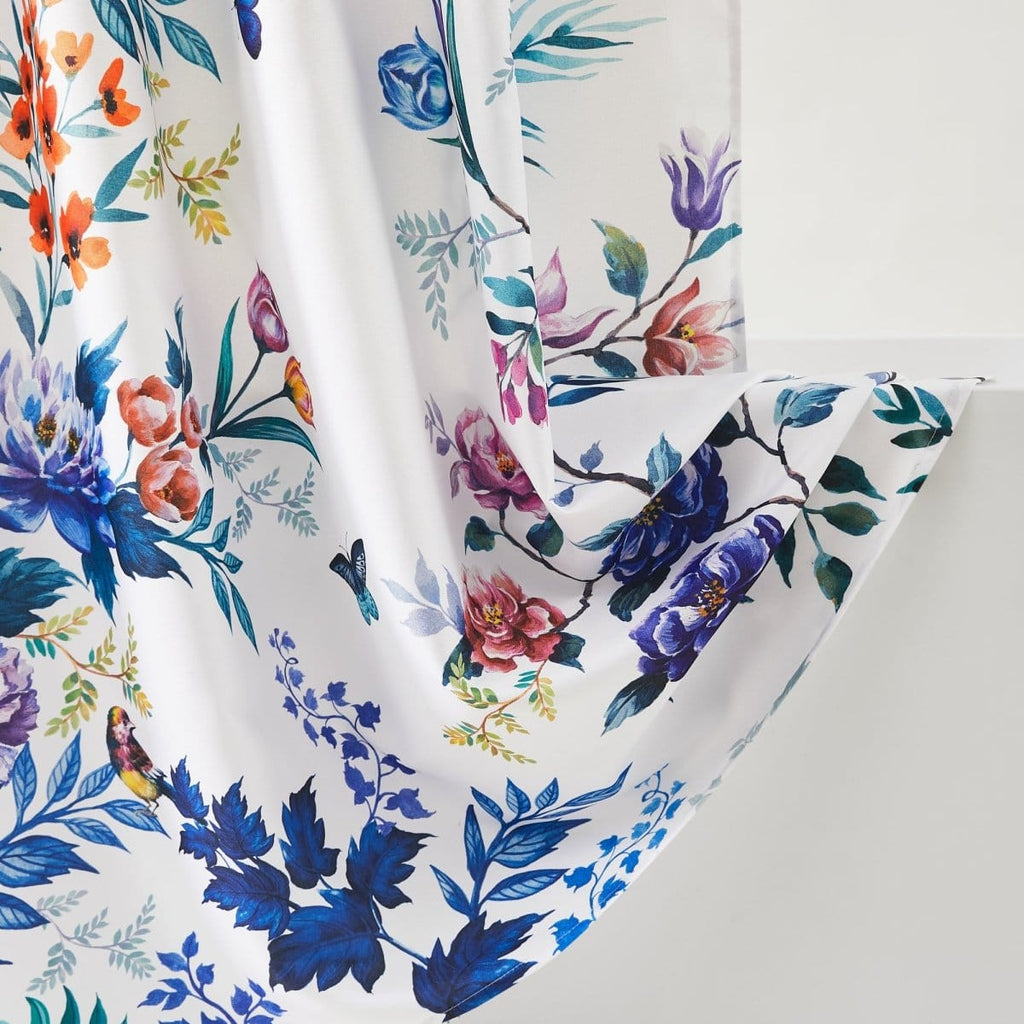Shower in wonderland of florals with this bold shower curtain, showcasing an exciting print of colorful flowers and birds. It easily transforms any bathroom into a cheerful sanctuary. Crafted from a shiny polyester fabric, this bath curtain measures 72 inches wide by 72 inches long. Installation is easy with 12 button holes at the top to hang with shower hooks or rings. Pair this fabric shower curtain with a liner, sold separately. Machine washable for easy care.