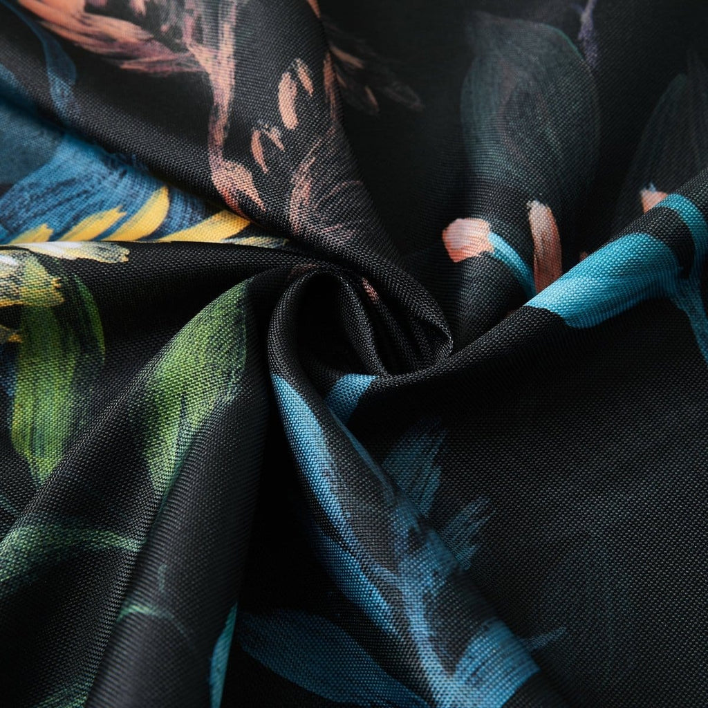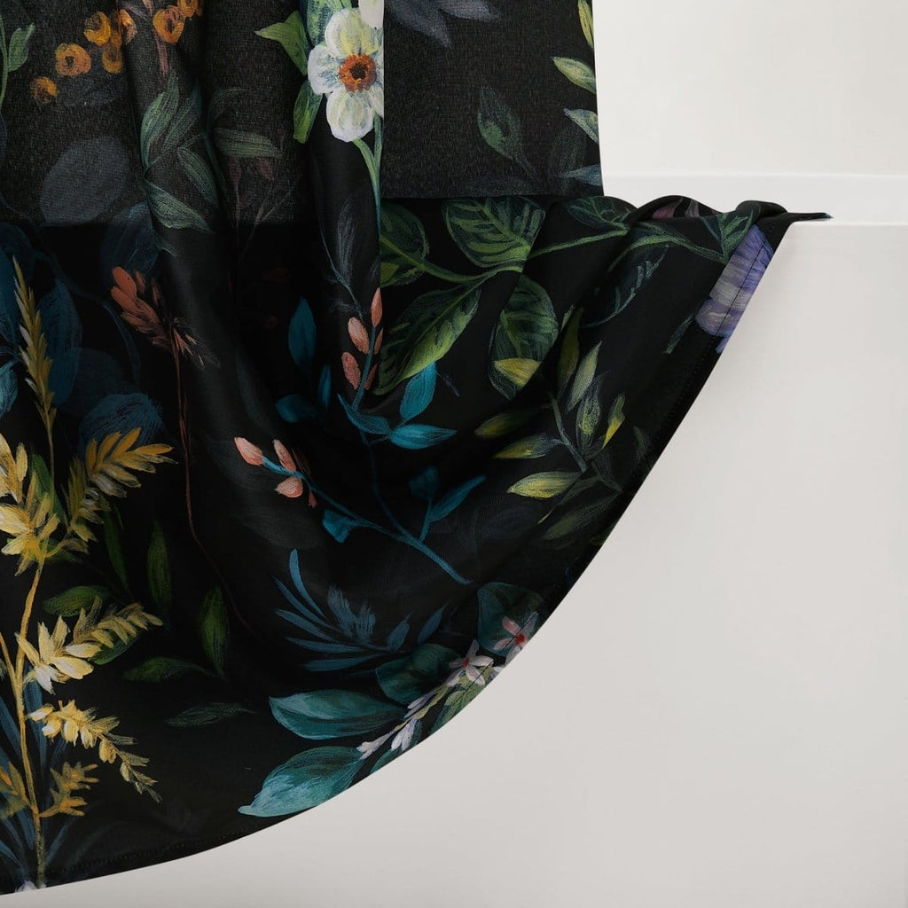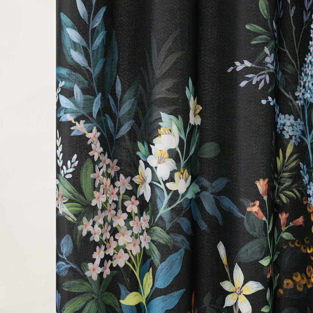 Step into a midnight oasis with this botanical shower curtain. This bath curtain adds drama and charm to your bathroom with a floral print on a rich black canvas. Perfect for modern Victorian or gothic decor style. Crafted from a soft polyester fabric and measuring 72 inches wide by 72 inches long. Installation is easy with 12 button holes at the top to hang with shower hooks or rings. Pair this fabric shower curtain with a liner, sold separately. STANDARD 100 by OEKO-TEX® certified, all components have been tested and certified free from harmful substances. Machine washable.