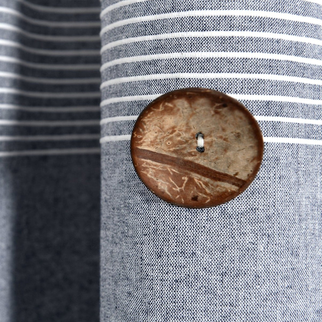 This Farmhouse Button Stripe Yarn Dyed Woven Cotton Window Curtain Panel Set in yellow, blue and navy color options contains 100% GRS certified recycled material, certified by GSCI - 1202. The eco-friendly recycled cotton makes this a purchase you can feel good about. It also make the panels soft to the touch for an excellent hand feel.