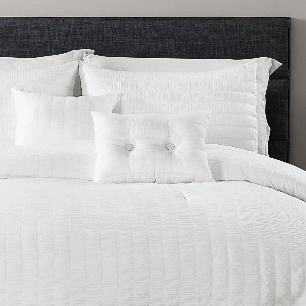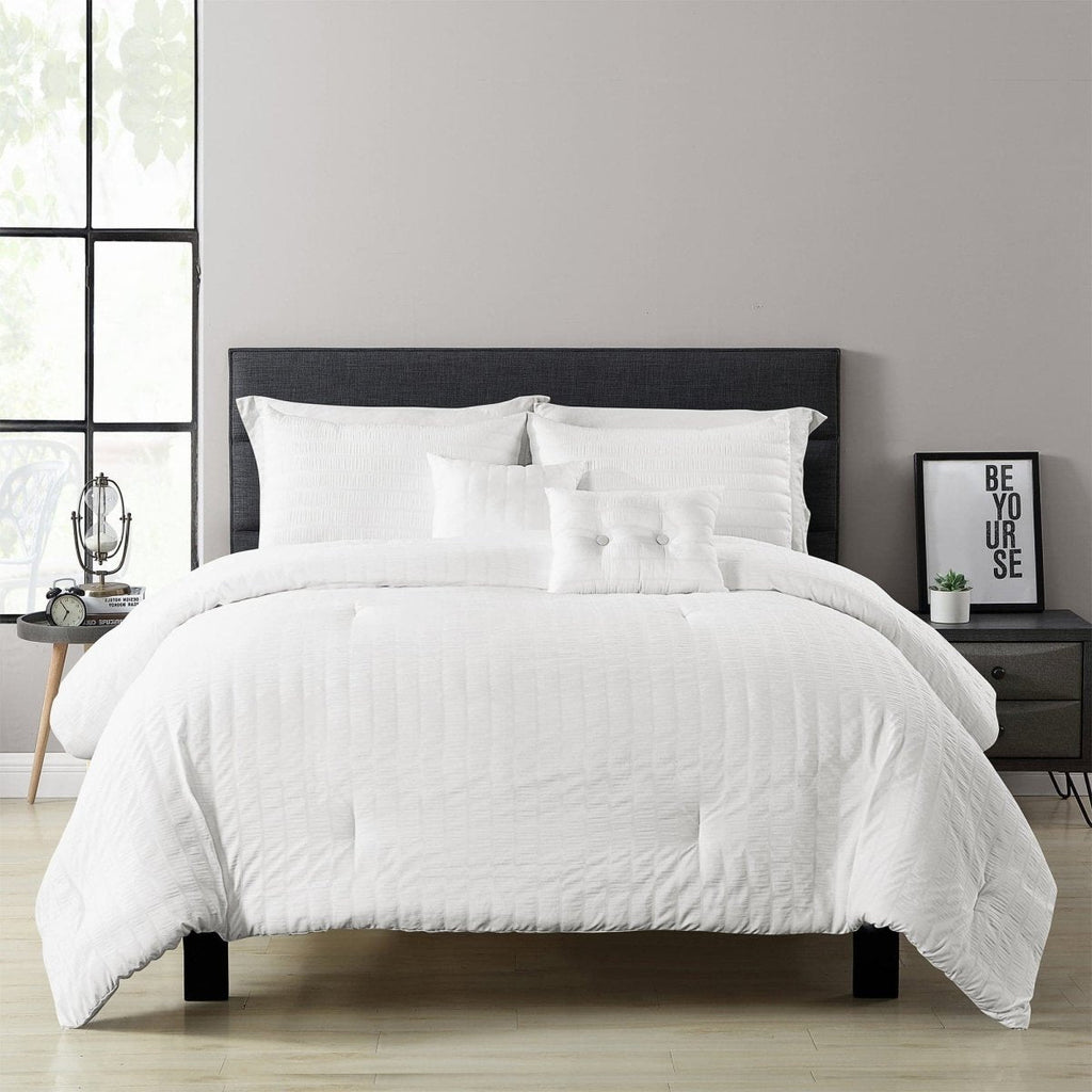 Refresh your master bedroom or guest bedroom with this Farmhouse Seersucker 5 Piece Comforter Set. The soft comforter will keep you warm and cozy year round. The minimalist solid color textured look brightens the space without overwhelming the room.
