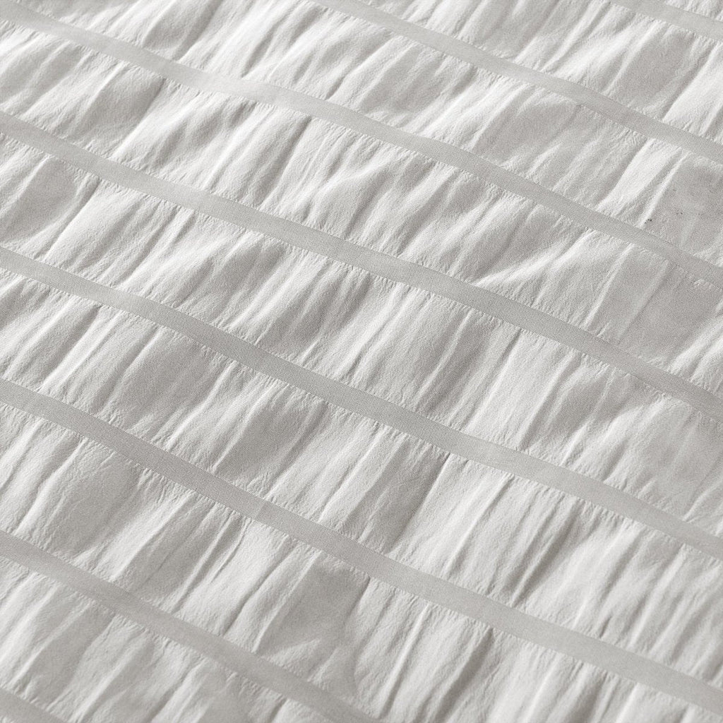The Farmhouse Seersucker 5 Piece Comforter Set includes a soft and luxurious 200 GSM comforter, two matching pillow shams and two decorative throw pillows to give your bed a complete and styled look. It is available in both King and Full/Queen sizes in white or light gray.