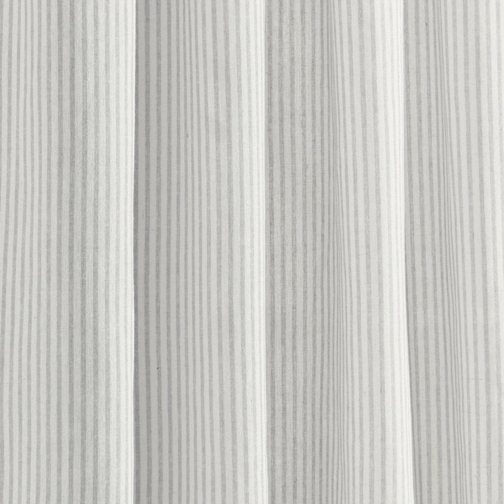 The Farmhouse Stripe Reyna Ruffle Window Curtain Panel Set is sold by the pair, so you will get two panels in each pack. Each curtain panel measures 84 inches long and 52 inches wide. It is currently available in three color options: light gray, neutral, and navy.